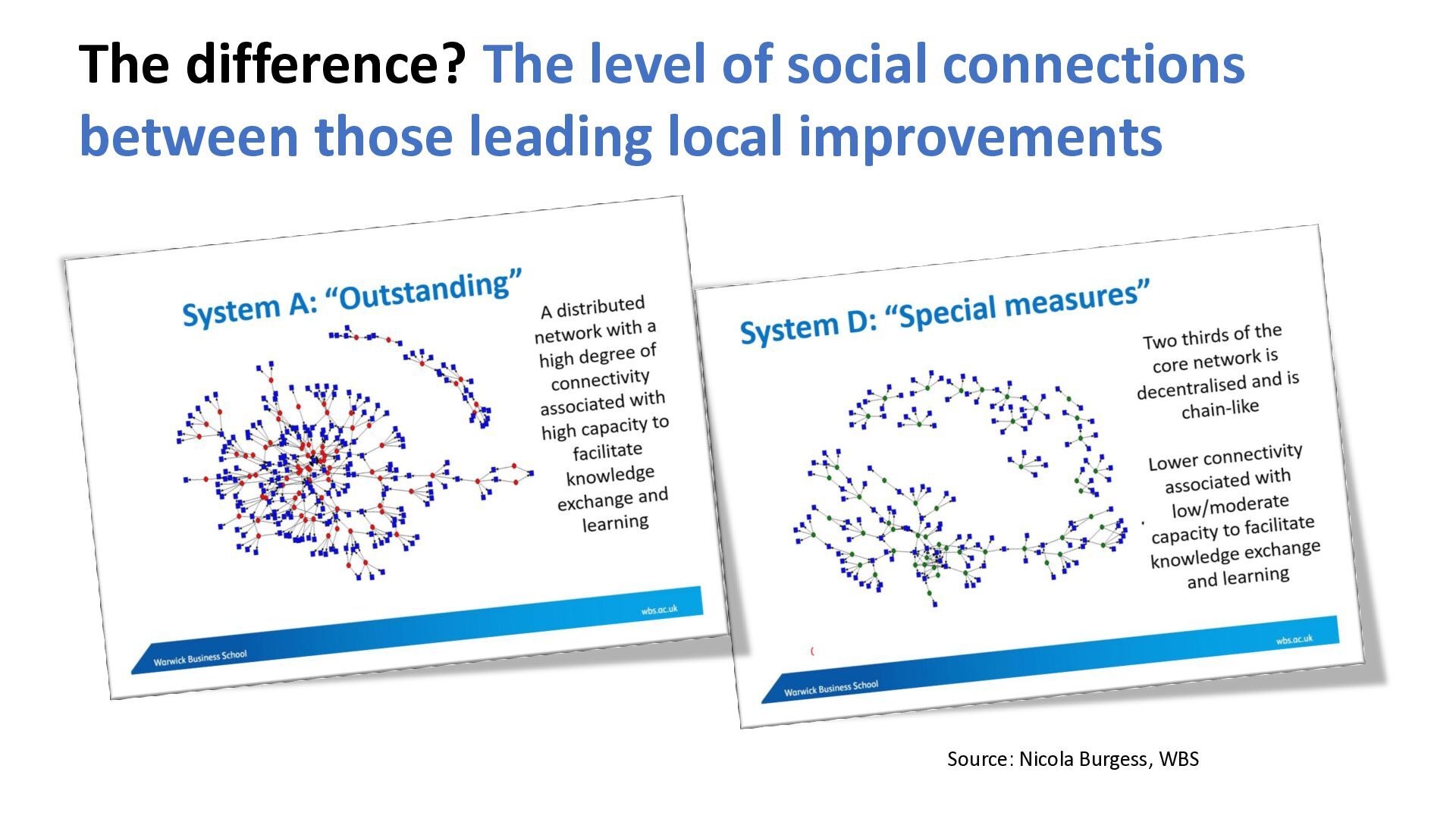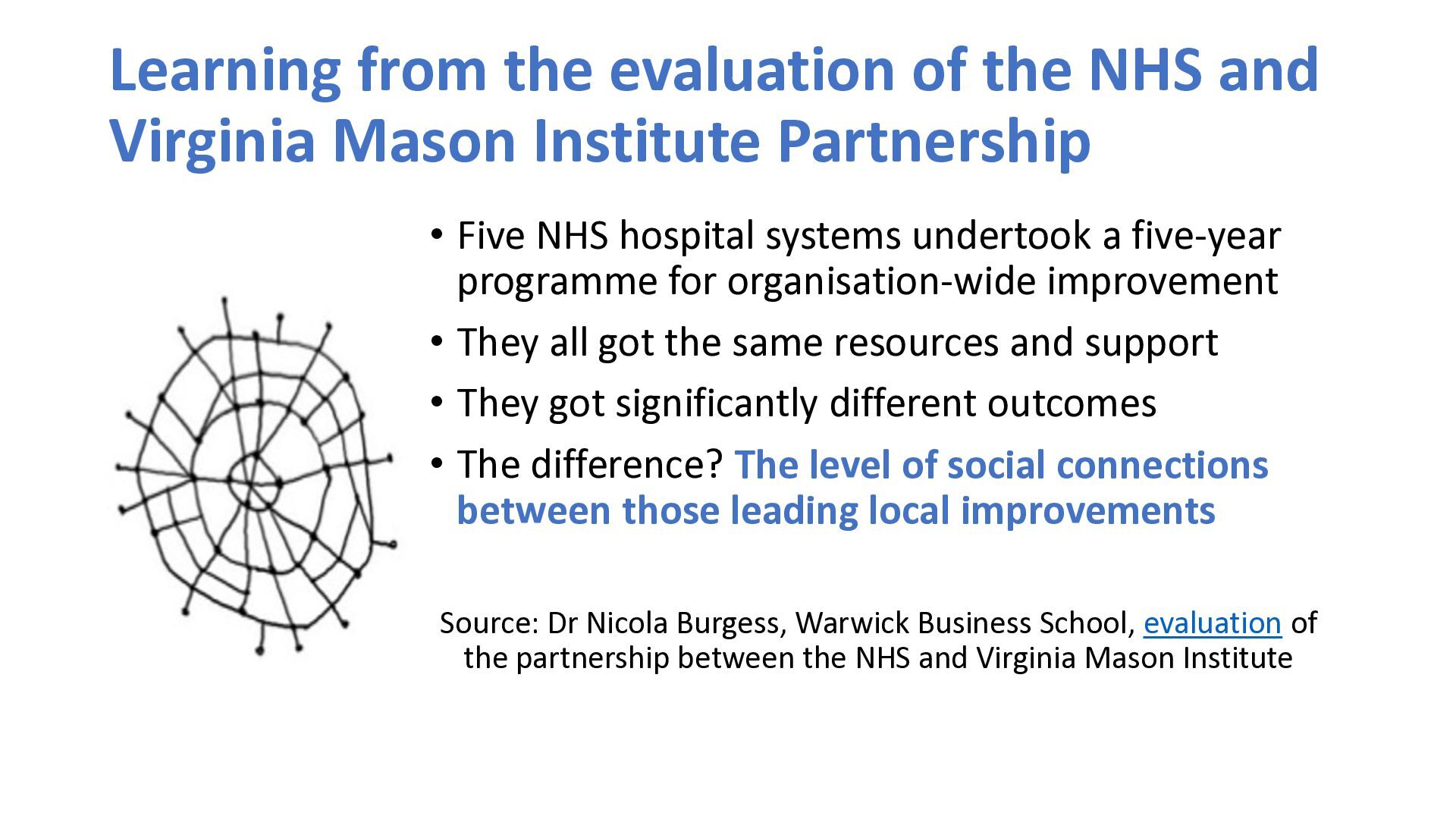 Institute Partnership • Five NHS hospital systems undertook a five-year programme for organisation-wide improvement • They all got the same resources and support • They got significantly different outcomes • The difference? The level of social connections between those leading local improvements Source: Dr Nicola Burgess, Warwick Business School, evaluation of the partnership between the NHS and Virginia Mason Institute