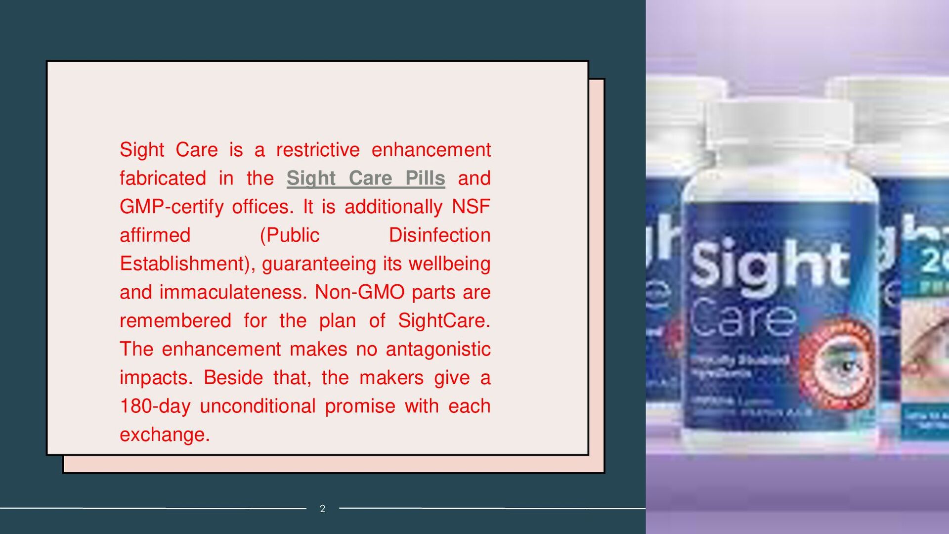 SightCare is a characteristic enhancement that advances sound 20/20 vision. It is a wholesome enhancement created from normal components that have been clinically confirmed. SightCare's solid vision recipe is accessible in simple to-swallow case structure, with every holder containing 60 vegan containers, enough for one month's utilization. The equation works on your vision while additionally advancing mind wellbeing. It can likewise help to keep up with night vision and lift eye sustenance.