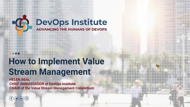 DEVOPS INSTITUTE. 6 Find the people accountable for every step in each value stream. Start Where you are Vision Connect the parts in your DevOps toolchain aligned to the steps in your Value Stream Map and start getting real-time data and insights into your value stream's flow. Use your insights to and design experiments to adapt and optimize your flow and continually delight your customers. Start by identifying your value streams - a value stream is anything that delivers a product or service. You're aiming to accelerate the flow of value to the customer. Bring the players in your value stream together for a mapping exercise: find where the idea starts, track every step until the value is delivered. Now you've automated your value stream map, use it! Set yourselves goals and use your retrospectives to look at where you are. Set your long term vision and goals Identify Map Inspect Organize Connect Adapt