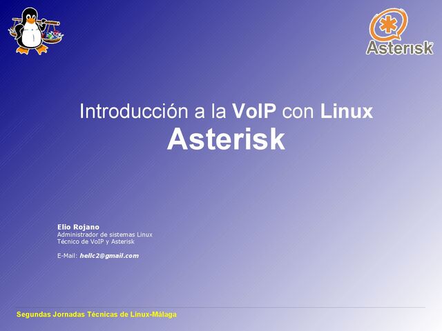 Linux y Asterisk Qué es la Voz sobre IP - Definión y explicación - Transcurso temporal de la VoIP - Panorama actual Qué es Asterisk - Descripción y objetivo - Partes de Asterisk - Comunidad Asterisk - Asterisk como soporte de Linux - Ventajas frente a otros sistemas cerrados Parte técnica de Asterisk - Diagrama de Asterisk - Protocolos de señalización - Códecs de audio y video - Estructura en árbol vs P2P Otros componentes de la VoIP - Estructura de la VoIP + Terminales VoIP + Tarjetas de comunicaciones - Evolución de la VoIP Índice General Elio Rojano Ruiz <[email protected]>