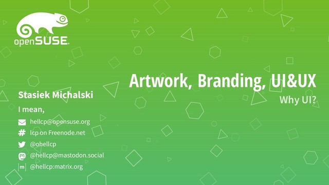 IRC, just come say hi and ask what to do, we will find you a task discord.gg/opensuse matrix.to/#/#opensuse-artwork:matrix.org #opensuse-artwork @ freenode.net