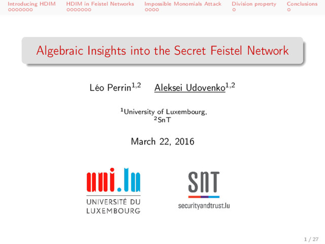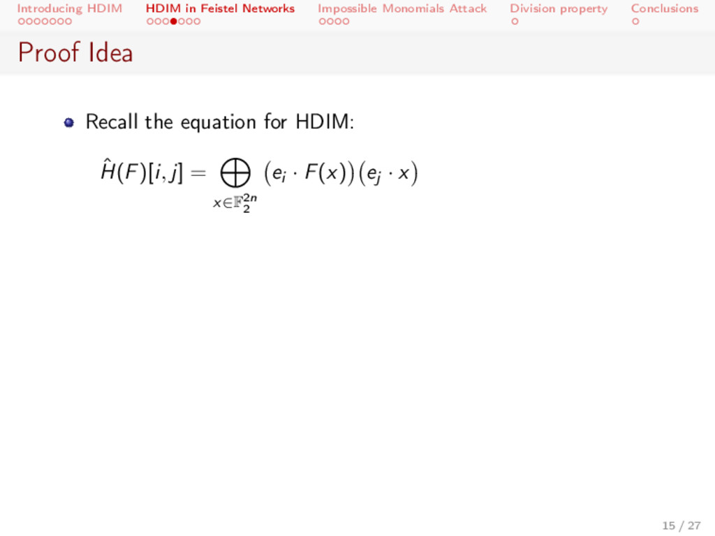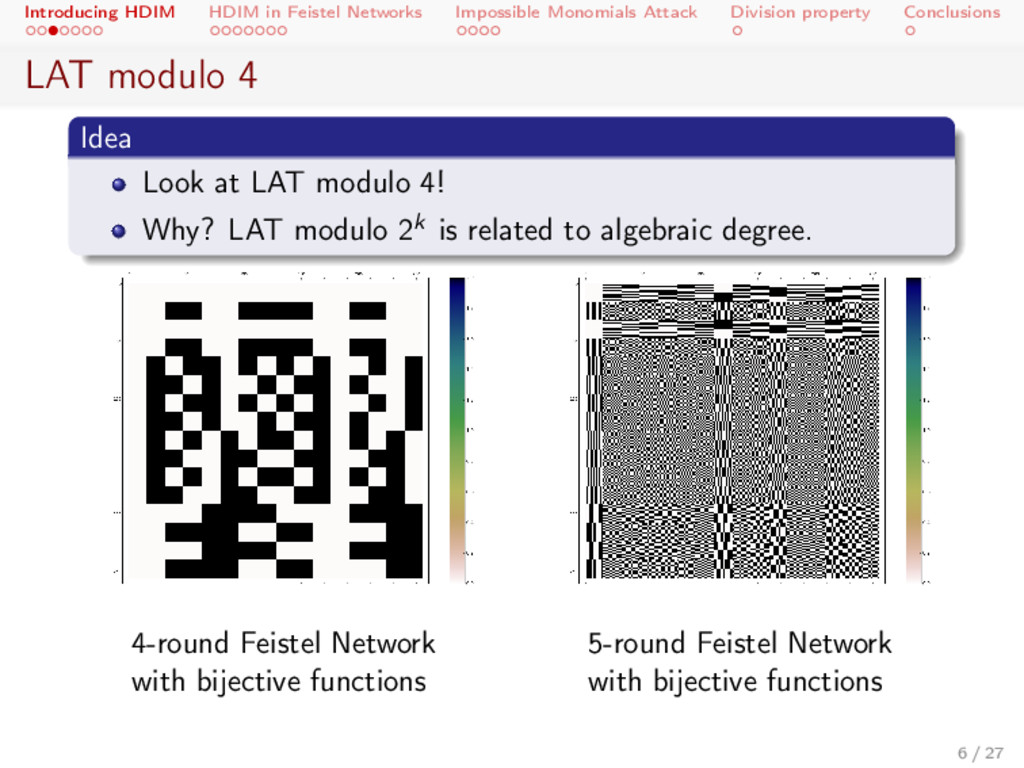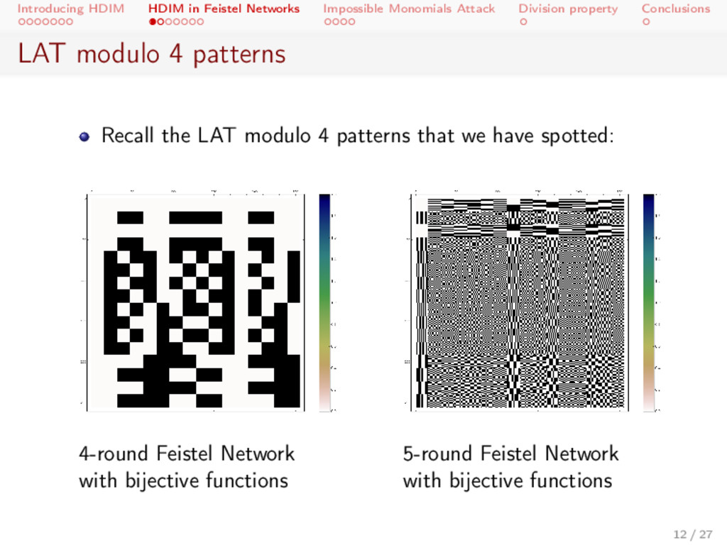 property Conclusions Generalization by Number of Rounds Theorem Let Fr d be a Feistel Network with r rounds and degree d of round functions. Let θ(d, r) = d r/2 −1 + d r/2 −1 be a parameter. Assume that the round functions are permutations. Then ˆ H(Fr d ) = 0 0 0 ? , when θ(d, r) < 2n. ˆ H(Fr d ) = 0 ? ? ? , when θ(d, r − 1) < 2n. For non-bijective round functions, the results hold for one round less. Distinguisher for Feistel Networks: one HDIM row or column is enough. Weak compared to known distinguishers for up to 5 rounds, but can attack more rounds when the degree is low. 14 / 27