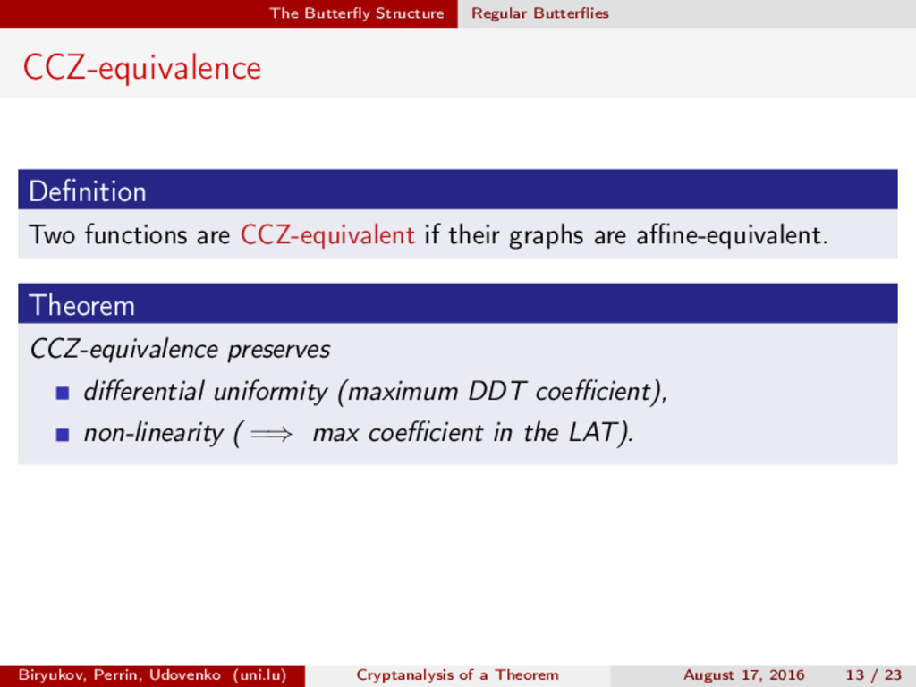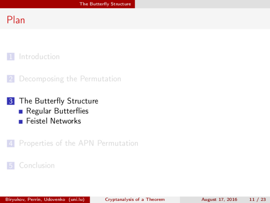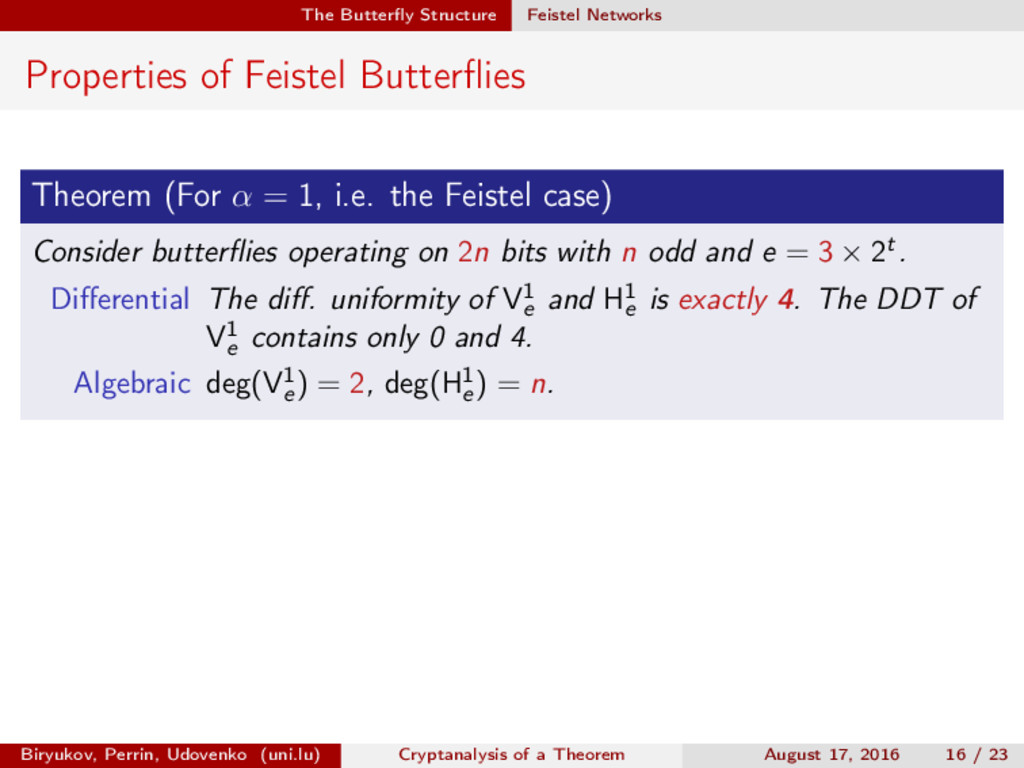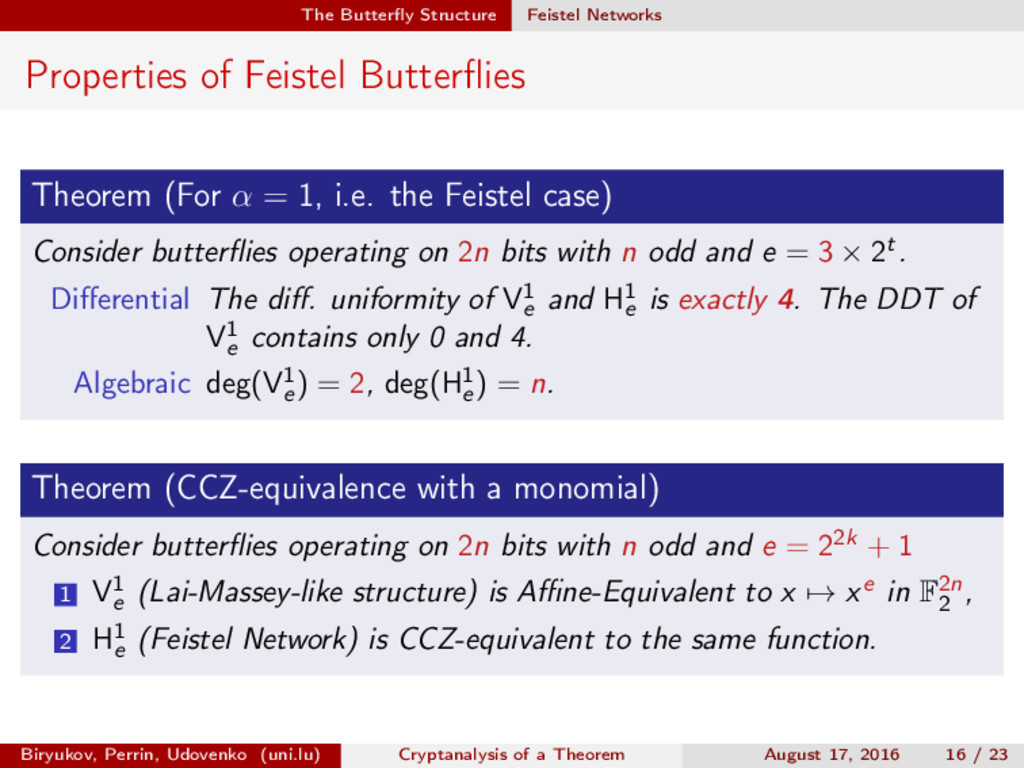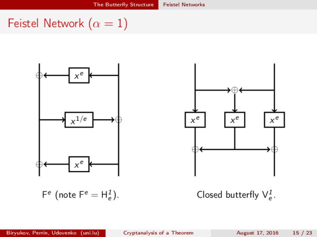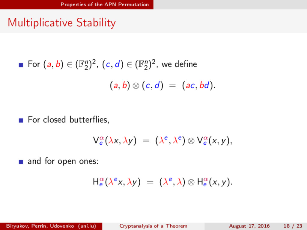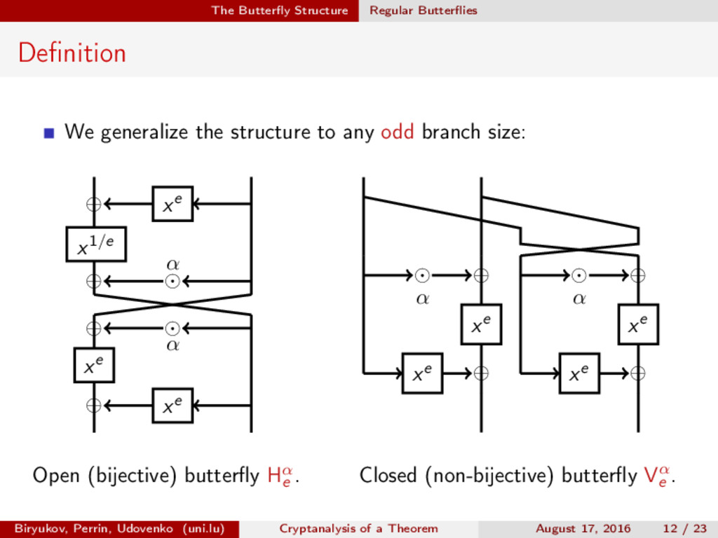 ∈ (Fn 2 )2, (c, d) ∈ (Fn 2 )2, we define (a, b) ⊗ (c, d) = (ac, bd). For closed butterflies, Ve (x, y) = (e, e) ⊗ Ve (x, y), and for open ones: He (ex, y) = (e, ) ⊗ He (x, y). Biryukov, Perrin, Udovenko (uni.lu) Cryptanalysis of a Theorem August 17, 2016 18 / 23