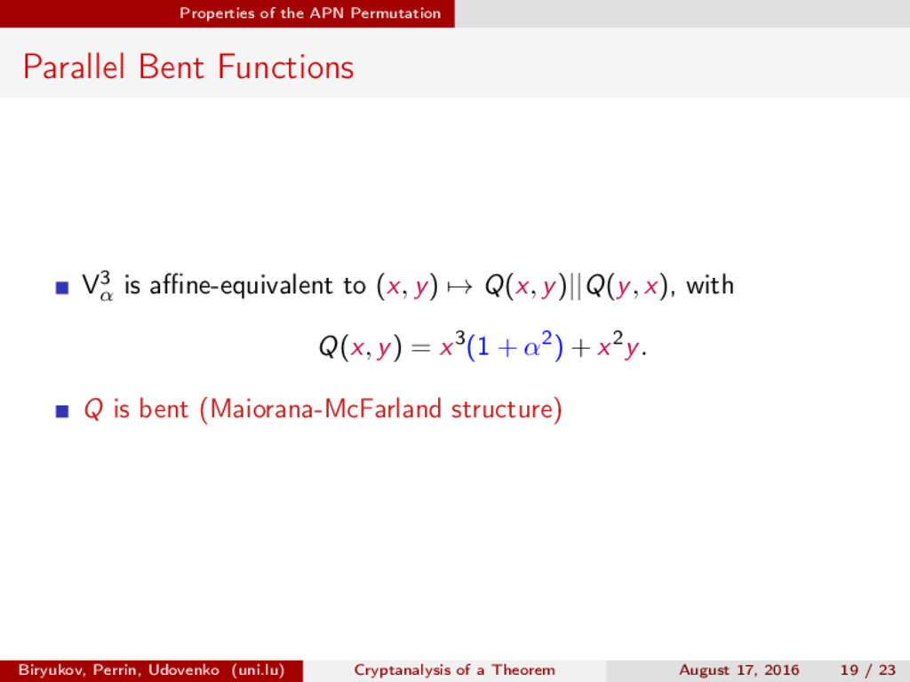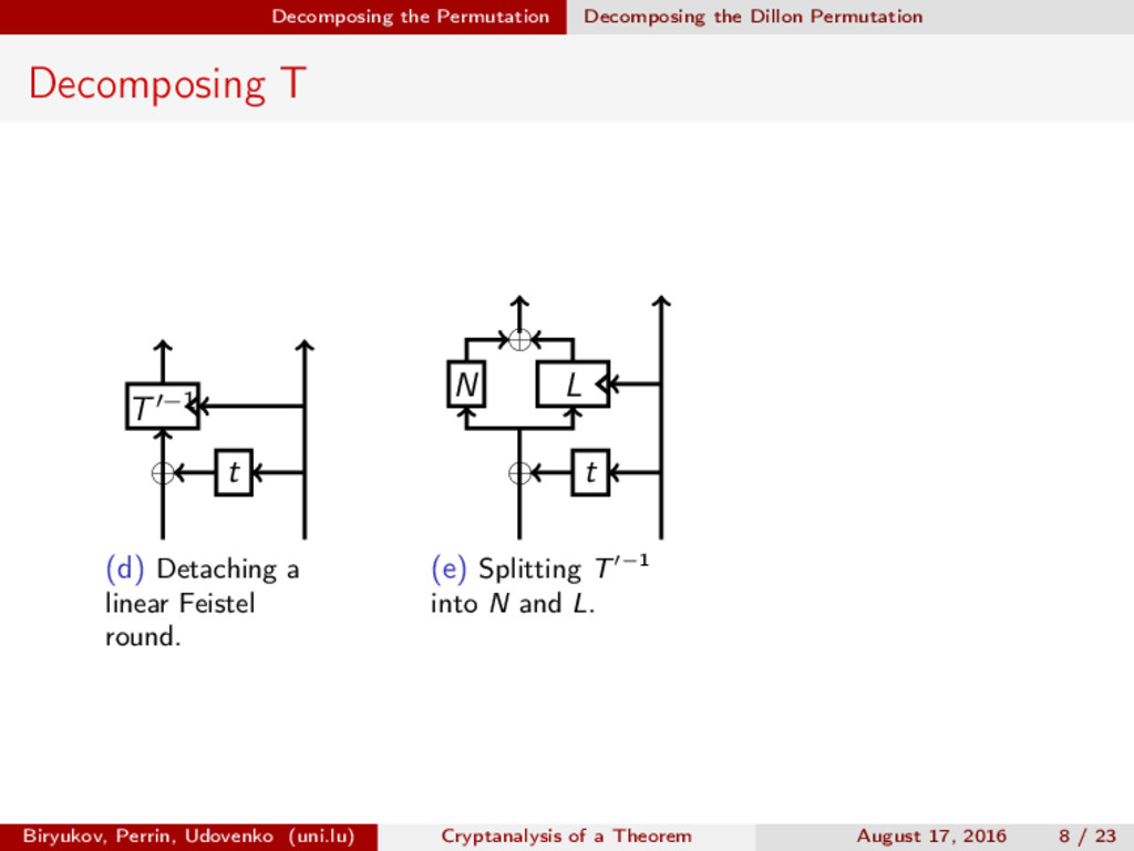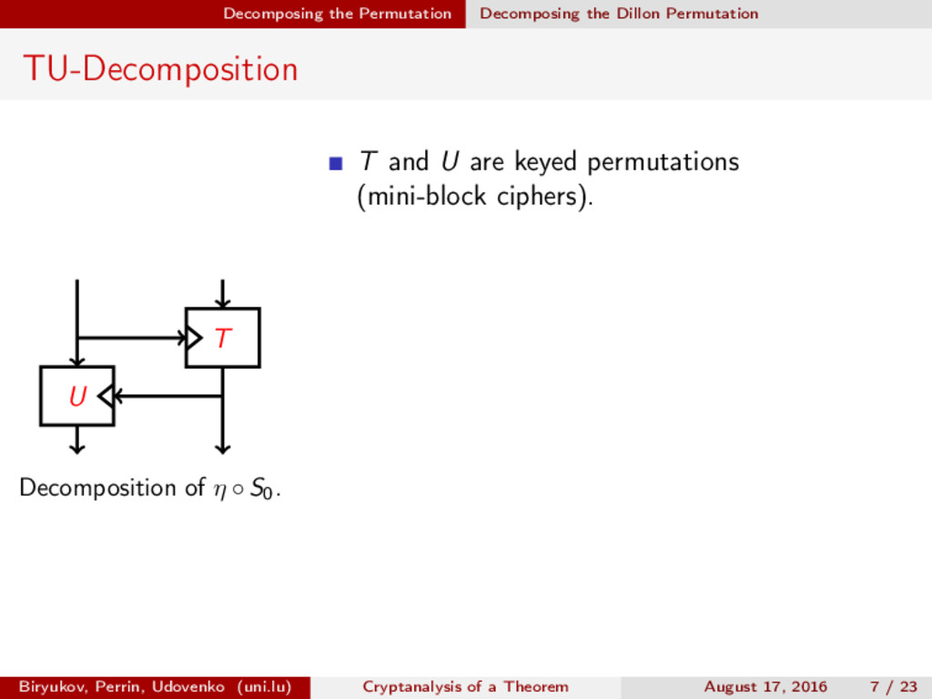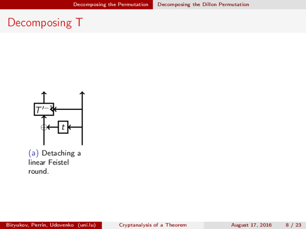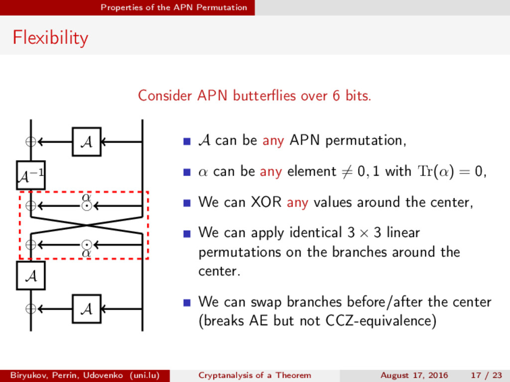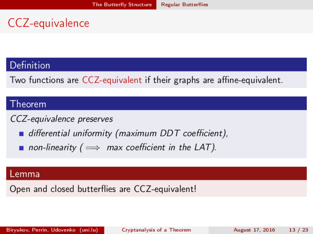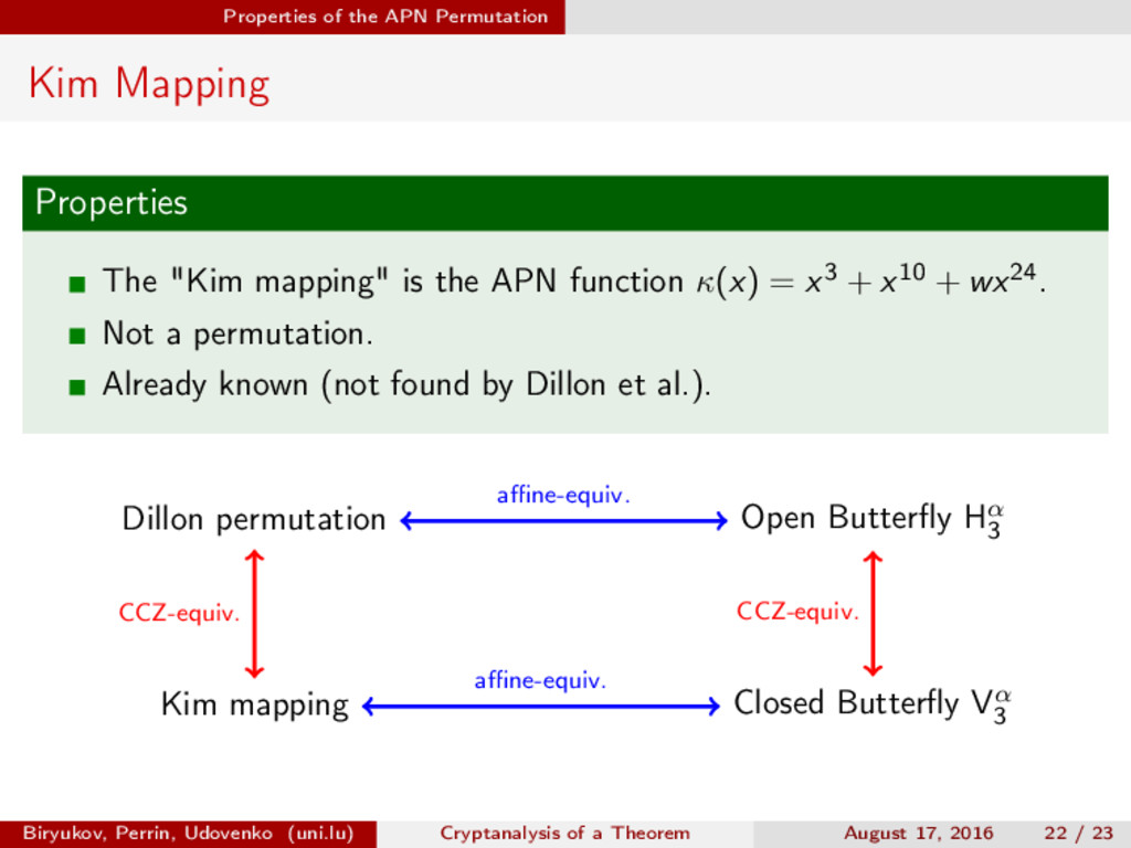 ∈ (Fn 2 )2, (c, d) ∈ (Fn 2 )2, we define (a, b) ⊗ (c, d) = (ac, bd). For closed butterflies, Ve (x, y) = (e, e) ⊗ Ve (x, y), and for open ones: He (ex, y) = (e, ) ⊗ He (x, y). Biryukov, Perrin, Udovenko (uni.lu) Cryptanalysis of a Theorem August 17, 2016 18 / 23