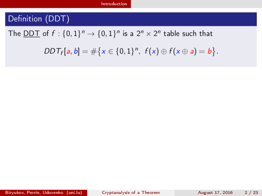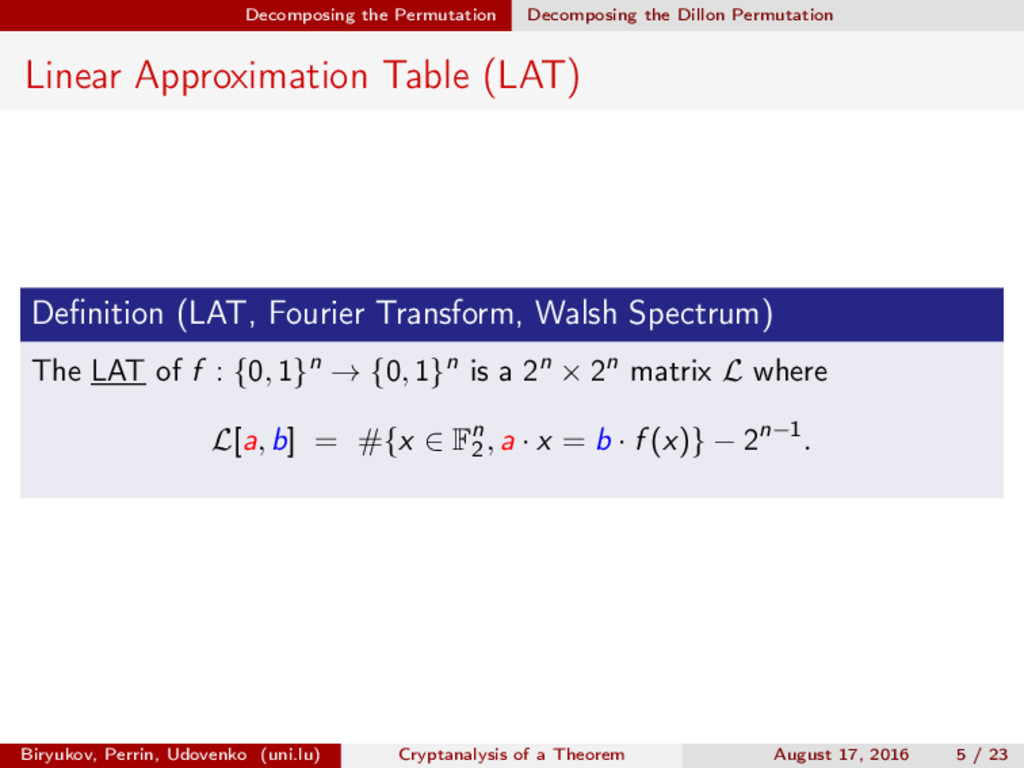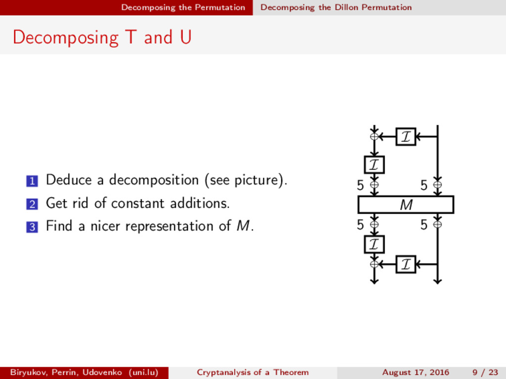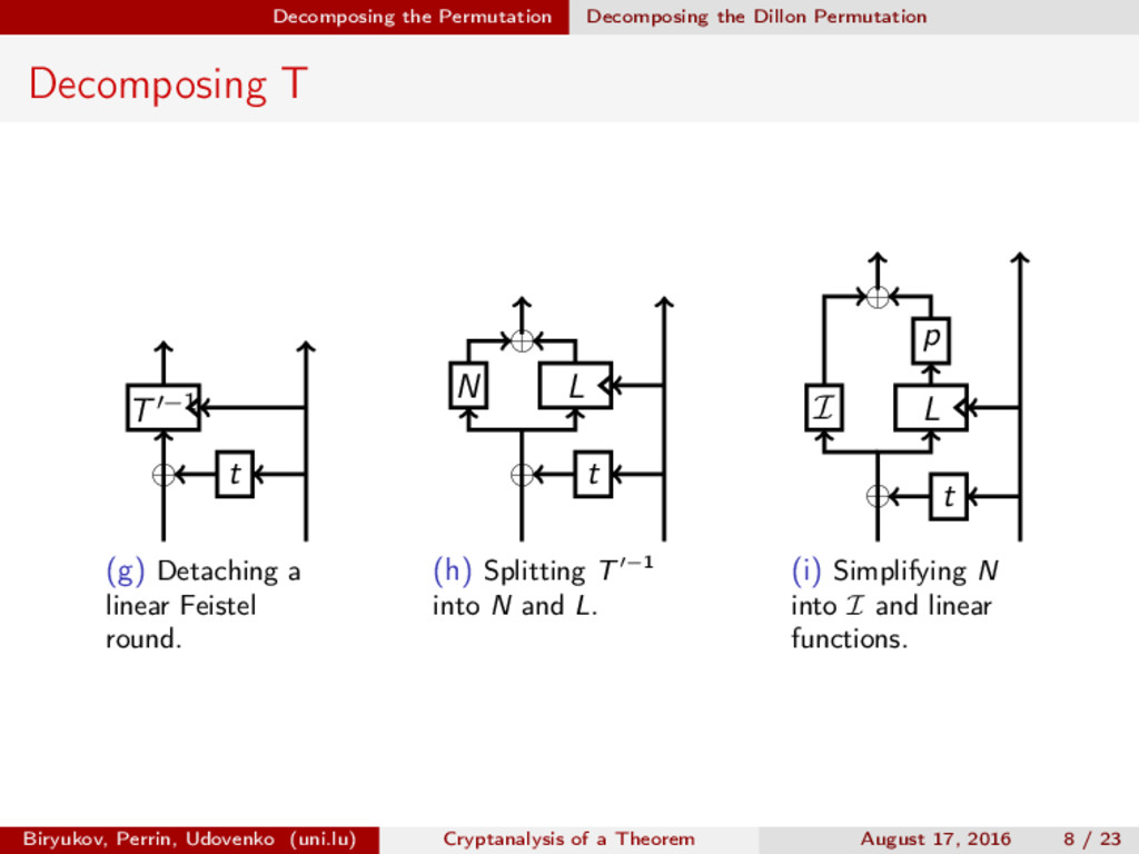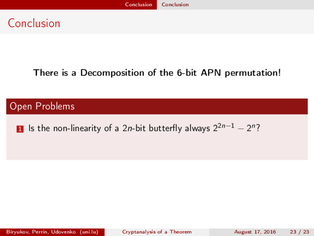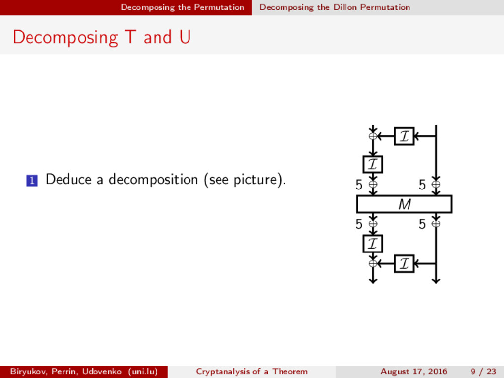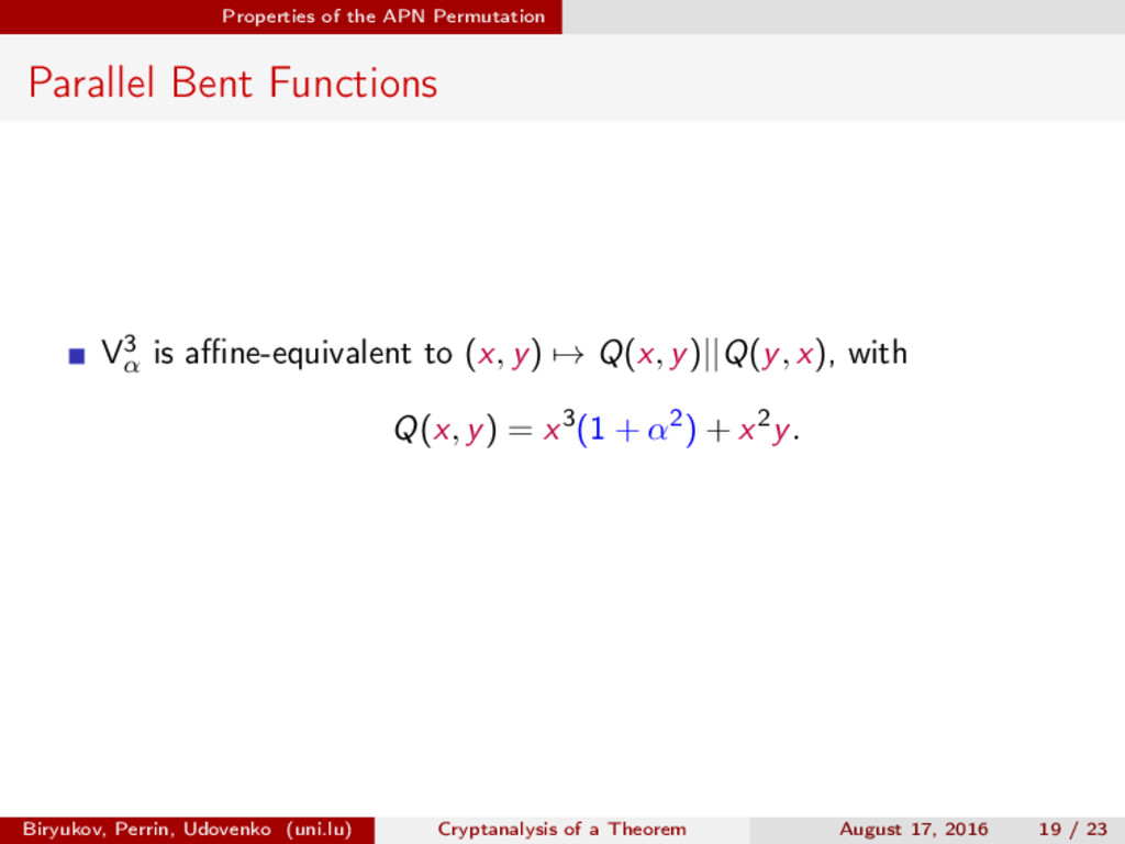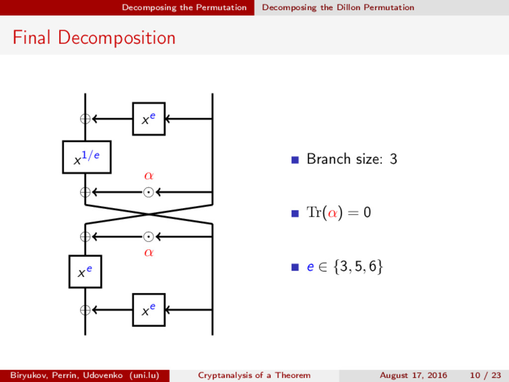 ∈ (Fn 2 )2, (c, d) ∈ (Fn 2 )2, we define (a, b) ⊗ (c, d) = (ac, bd). For closed butterflies, Ve (x, y) = (e, e) ⊗ Ve (x, y), and for open ones: He (ex, y) = (e, ) ⊗ He (x, y). Biryukov, Perrin, Udovenko (uni.lu) Cryptanalysis of a Theorem August 17, 2016 18 / 23