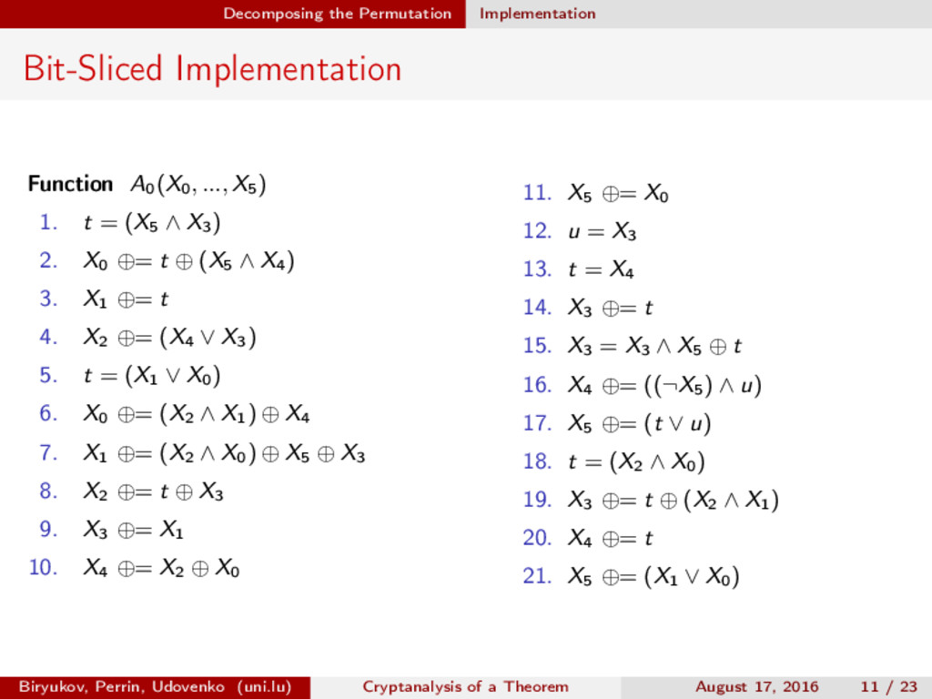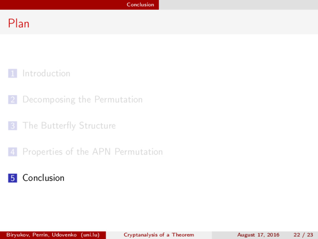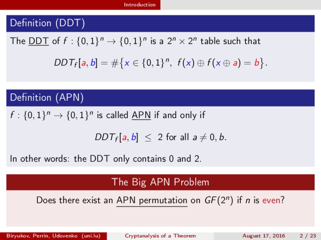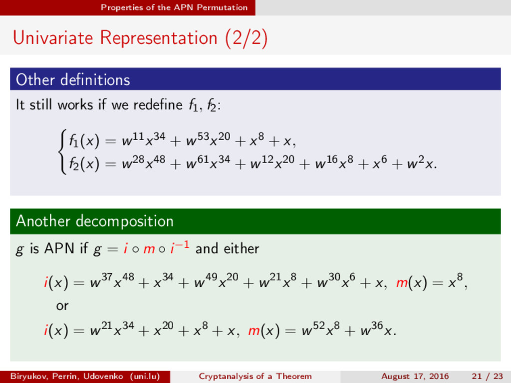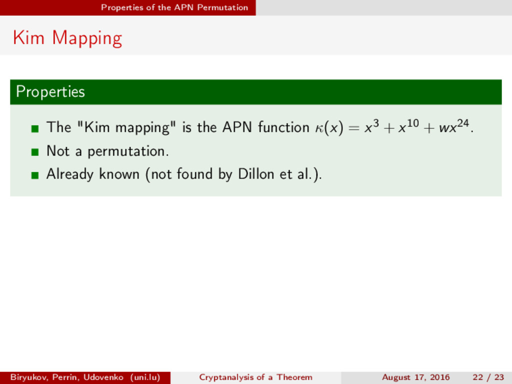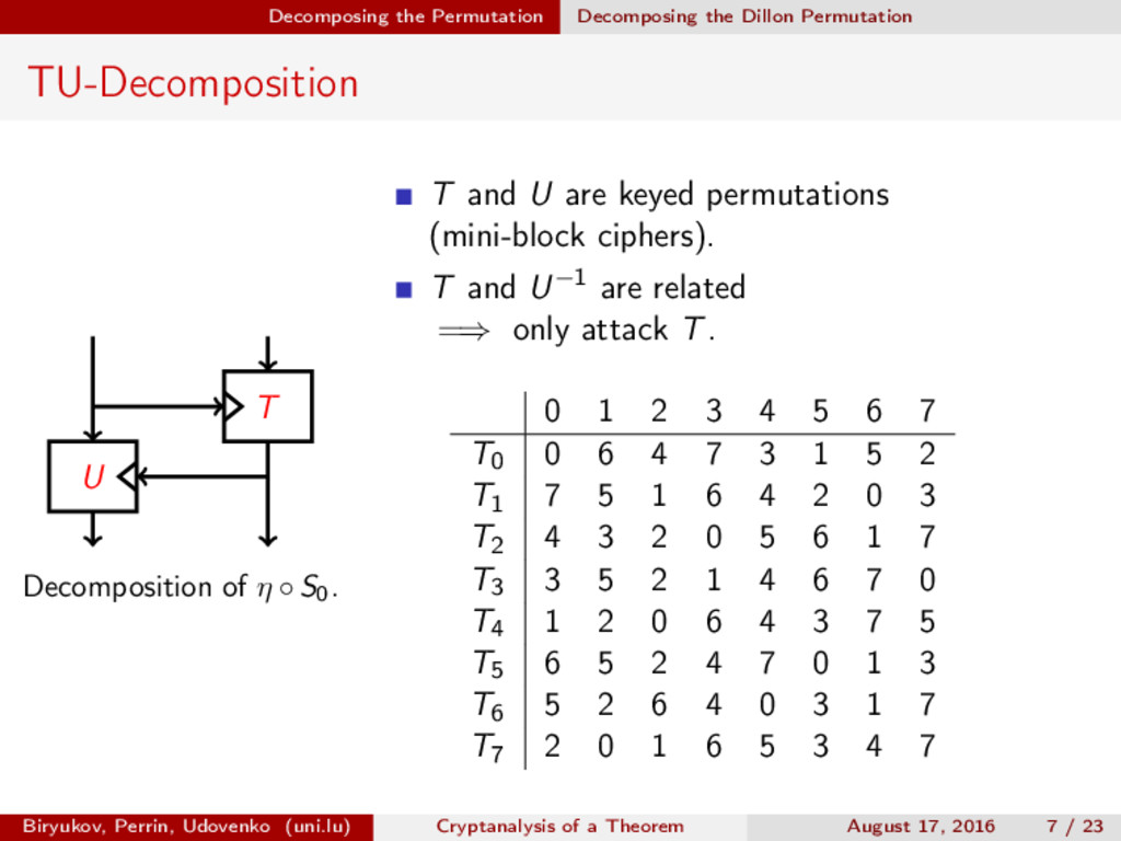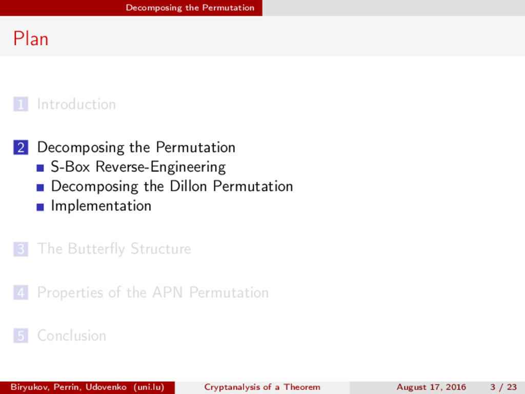∈ (Fn 2 )2, (c, d) ∈ (Fn 2 )2, we define (a, b) ⊗ (c, d) = (ac, bd). For closed butterflies, Ve (x, y) = (e, e) ⊗ Ve (x, y), and for open ones: He (ex, y) = (e, ) ⊗ He (x, y). Biryukov, Perrin, Udovenko (uni.lu) Cryptanalysis of a Theorem August 17, 2016 18 / 23