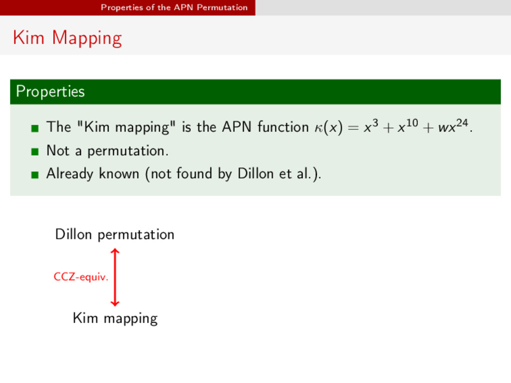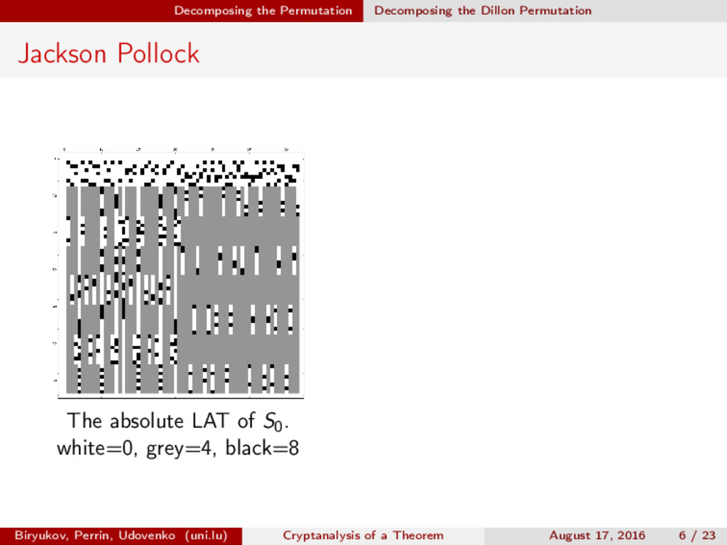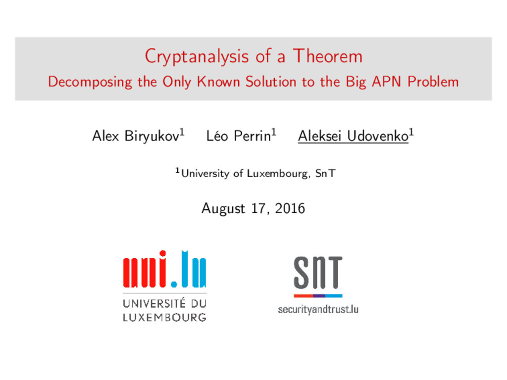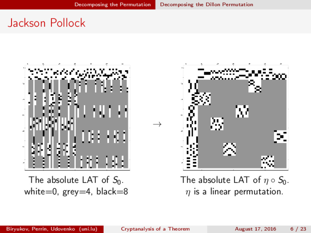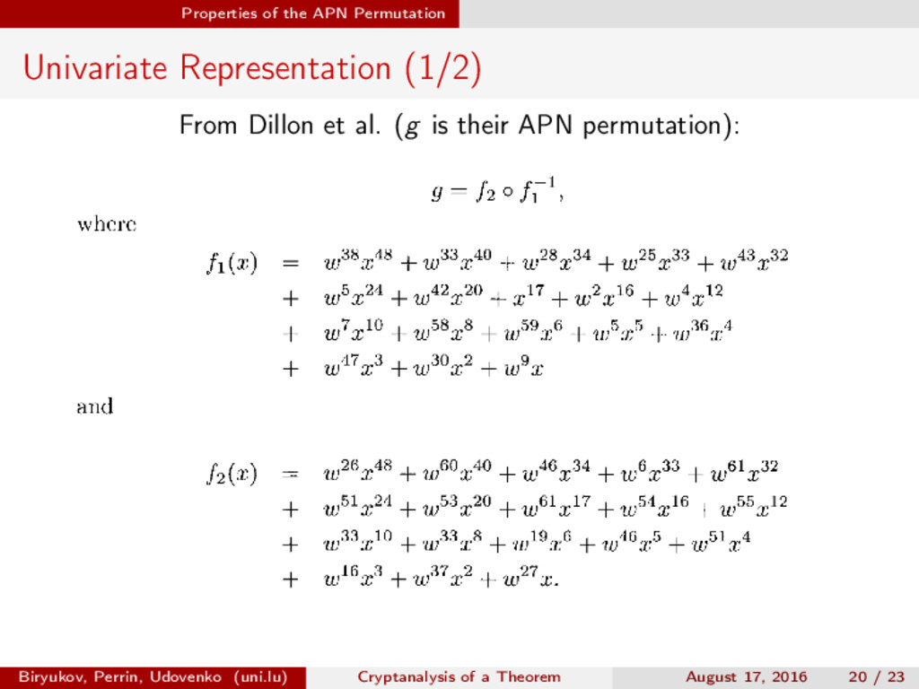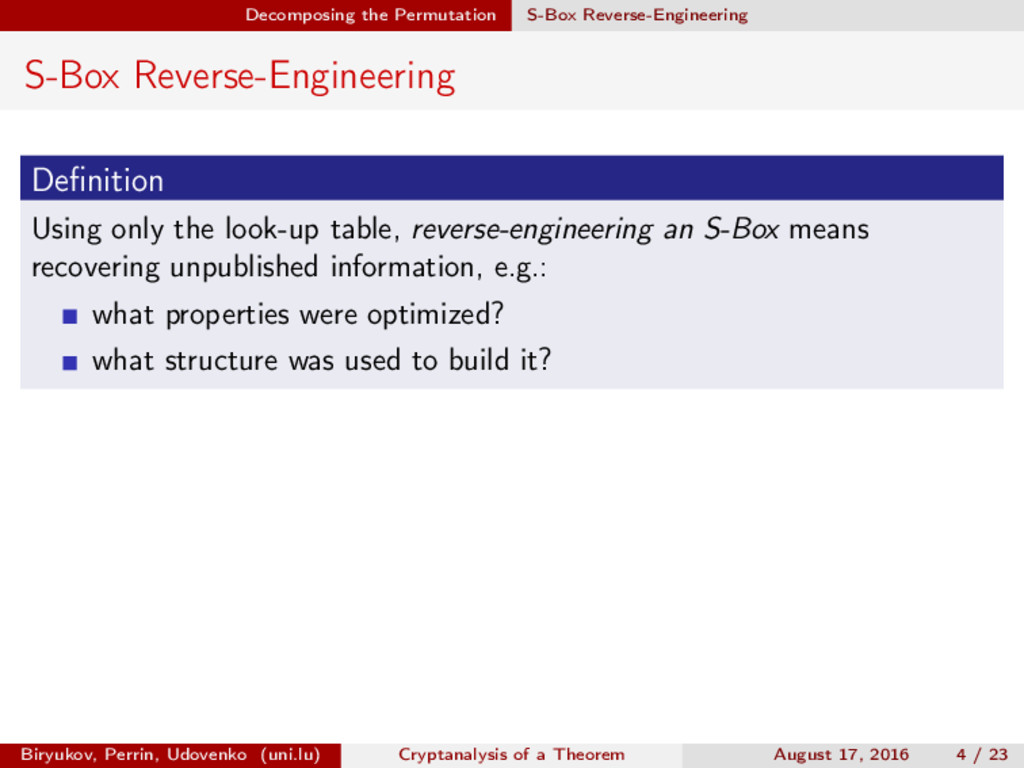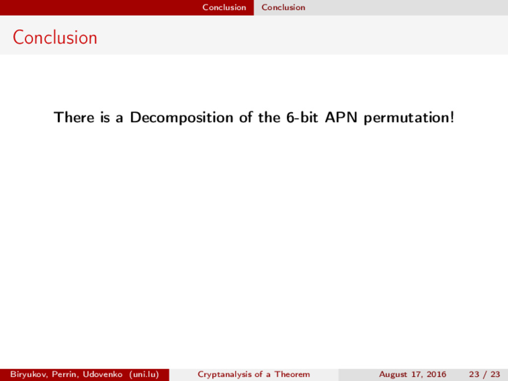 ∈ (Fn 2 )2, (c, d) ∈ (Fn 2 )2, we define (a, b) ⊗ (c, d) = (ac, bd). For closed butterflies, Ve (x, y) = (e, e) ⊗ Ve (x, y), and for open ones: He (ex, y) = (e, ) ⊗ He (x, y). Biryukov, Perrin, Udovenko (uni.lu) Cryptanalysis of a Theorem August 17, 2016 18 / 23