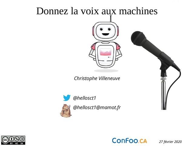 Présentation effectuée à Confoo 2020 (27 février 2020) par Christophe Villeneuve sur "Donnez la voix aux machines".