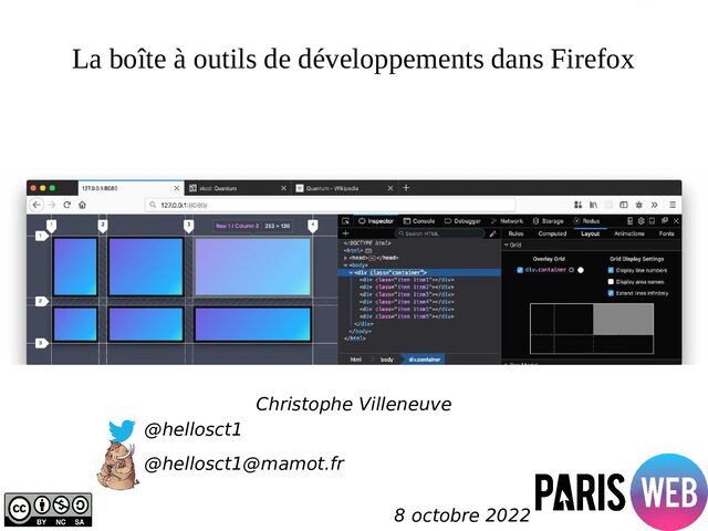 Présentation effectuée à Paris Web par Christophe Villeneuve sur "La boîte à outils de développements dans Firefox".