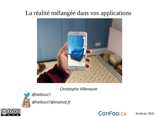 Présentation effectuée à Confoo 2020 (26 février 2020) par Christophe Villeneuve sur "la réalité mélangée dans vos applications".