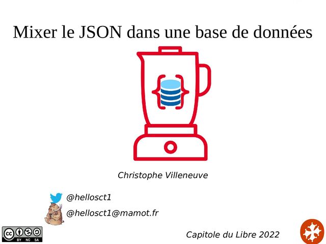 Présentation effectuée au Capitole du libre par Christophe Villeneuve sur "Mixer le JSON dans une base de données".