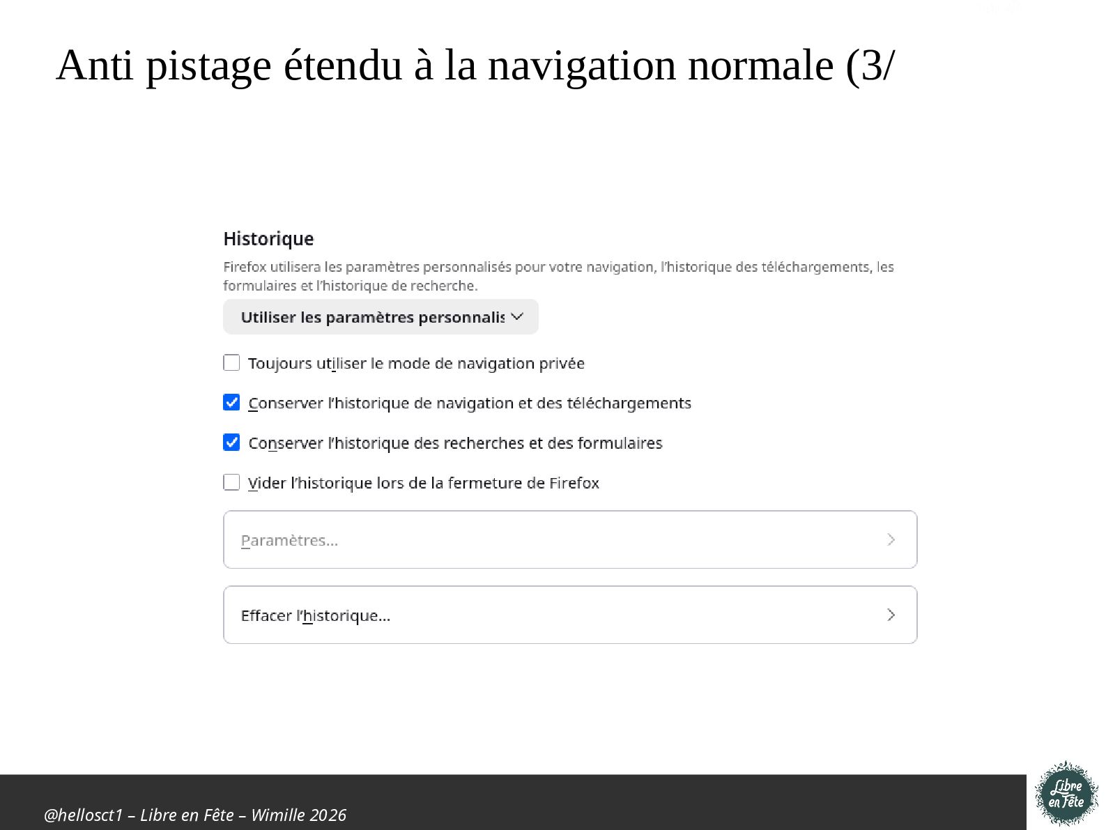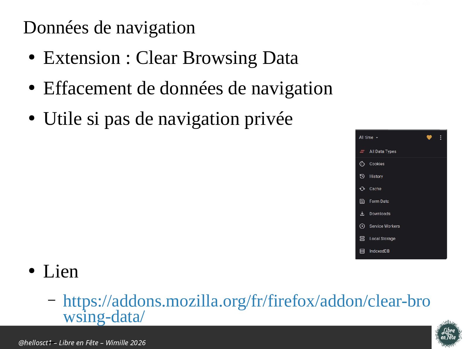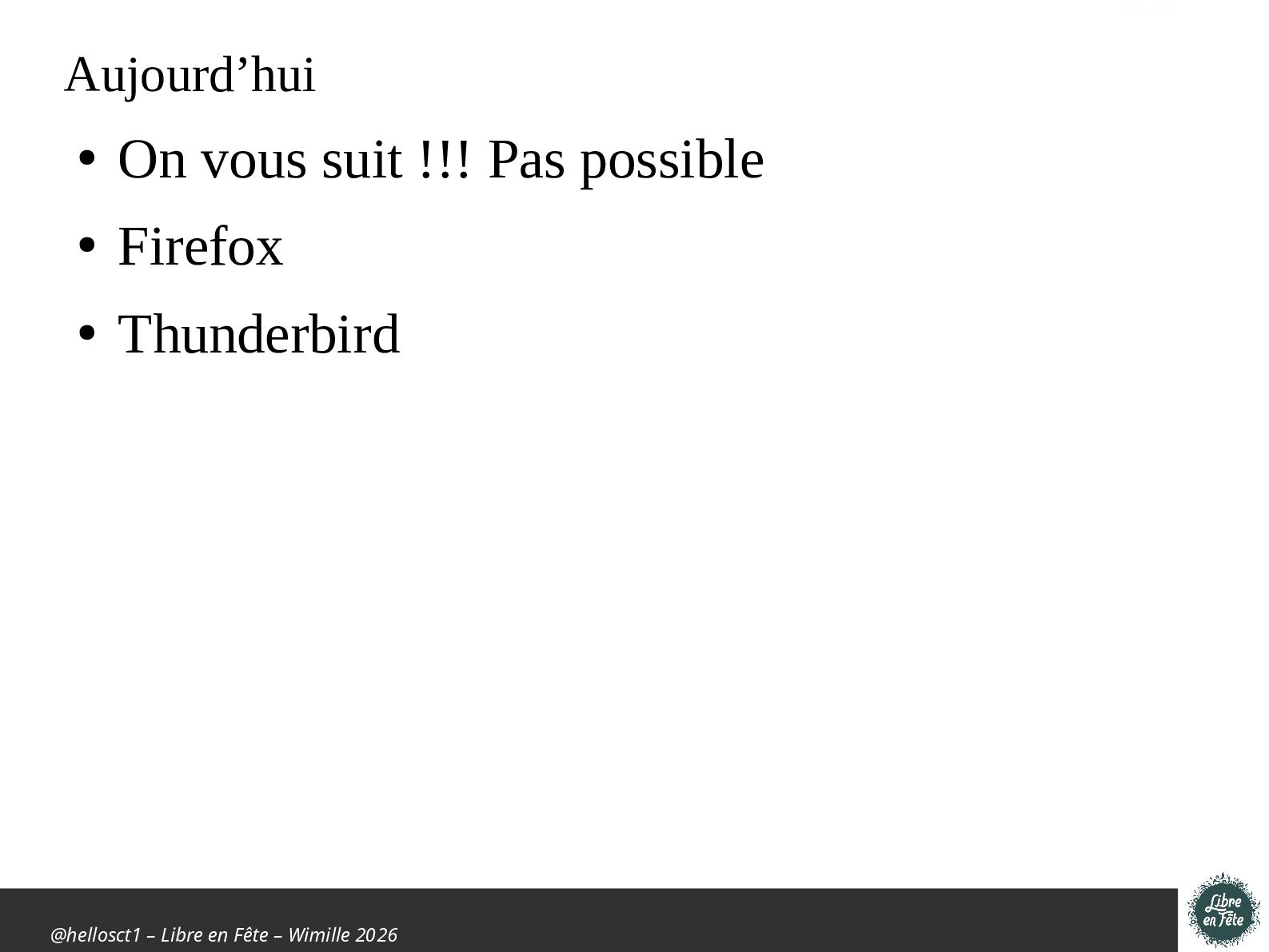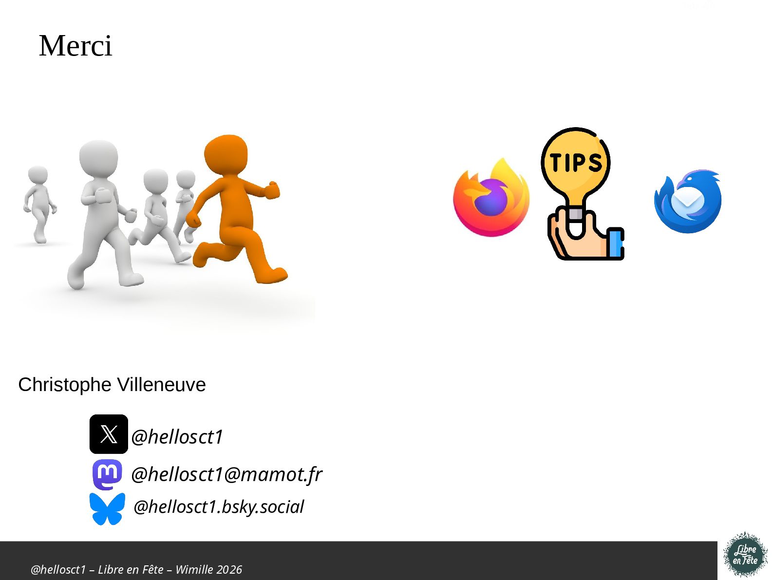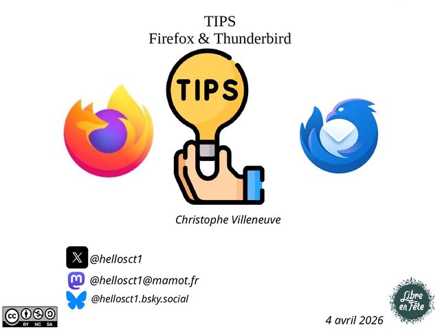 Présentation effectuée à Libre en fête 2026 à Wimille par Christophe Villeneuve sur "TIPS Firefox & Thunderbird".