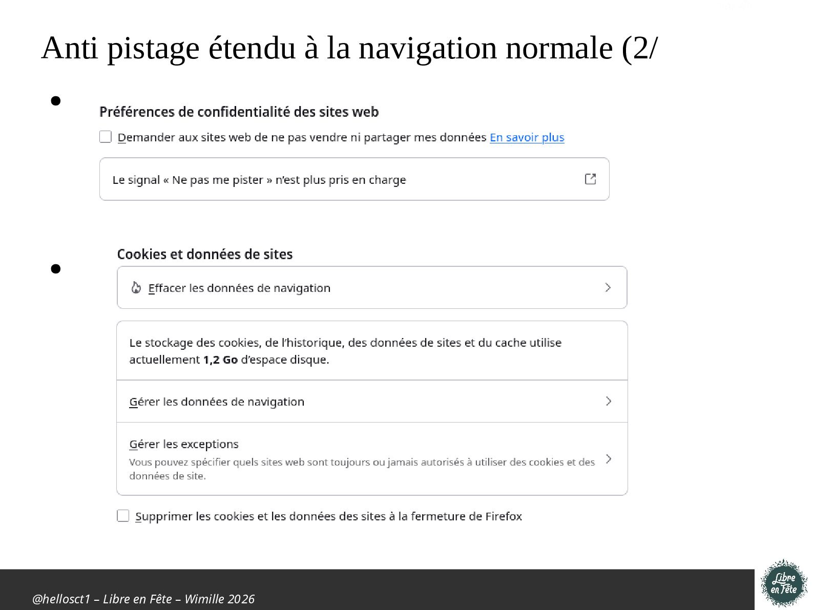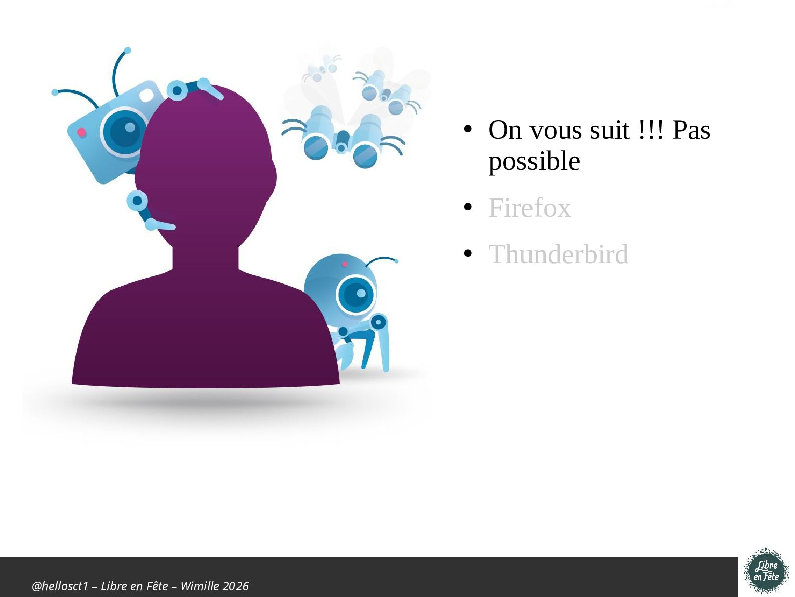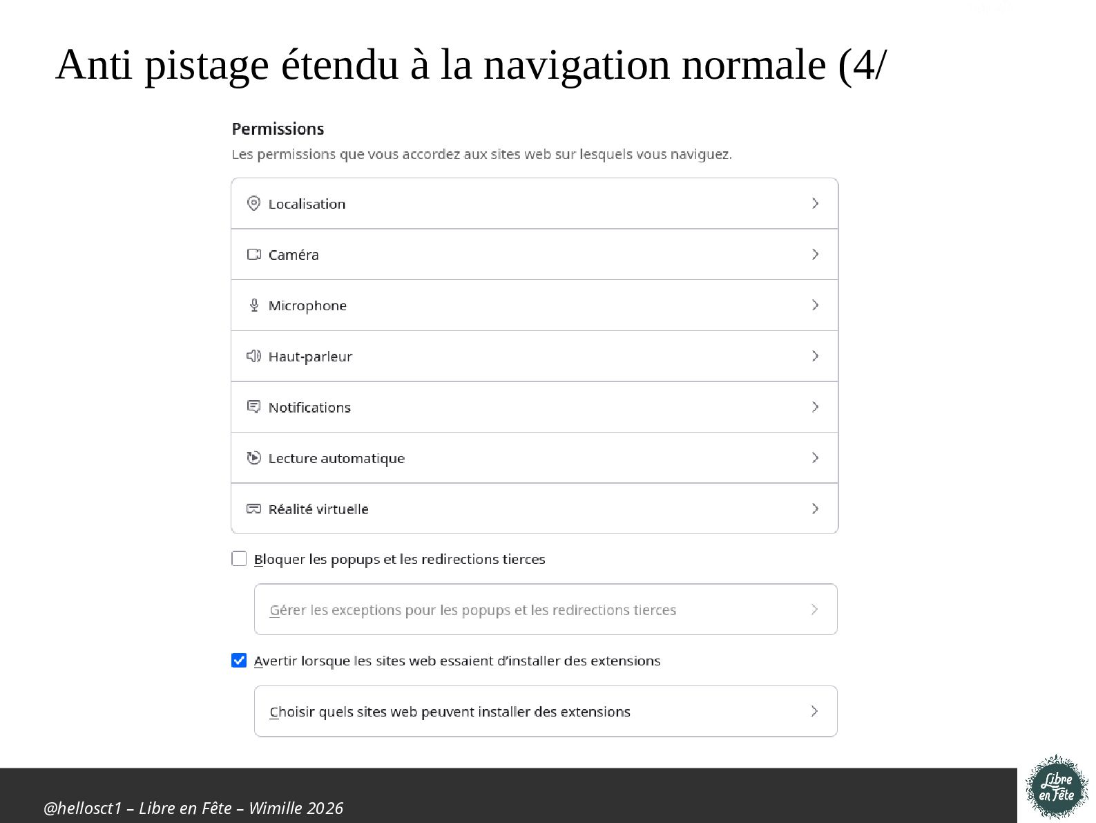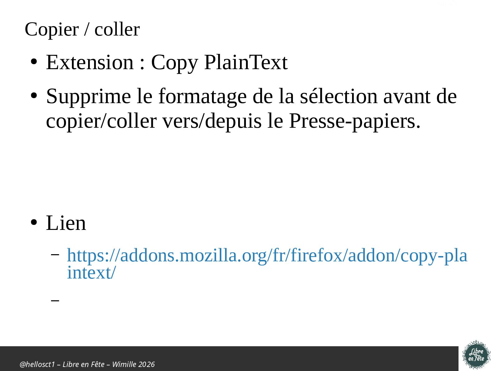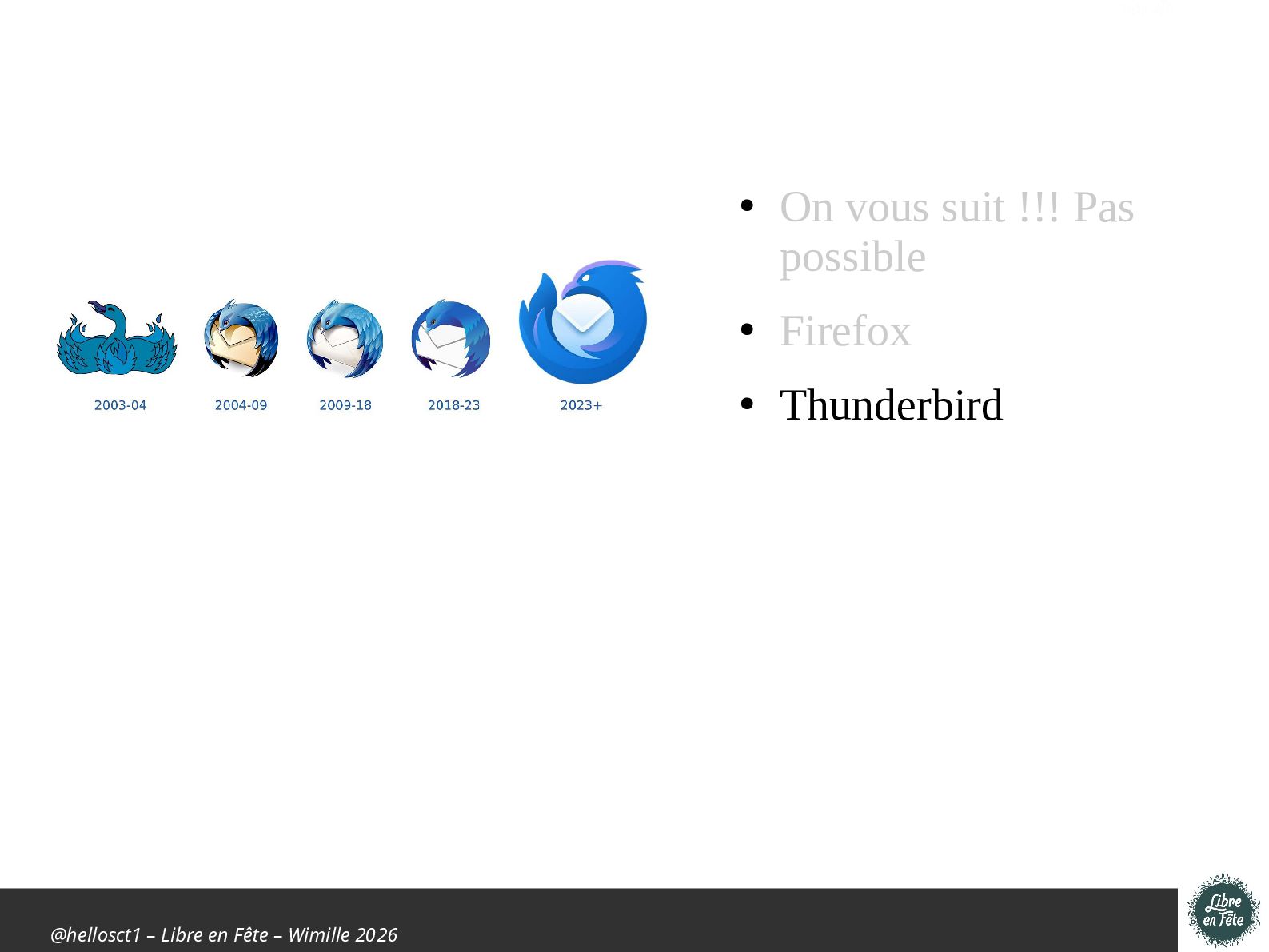 Présentation effectuée à Libre en fête 2026 à Wimille par Christophe Villeneuve sur "TIPS Firefox & Thunderbird".
