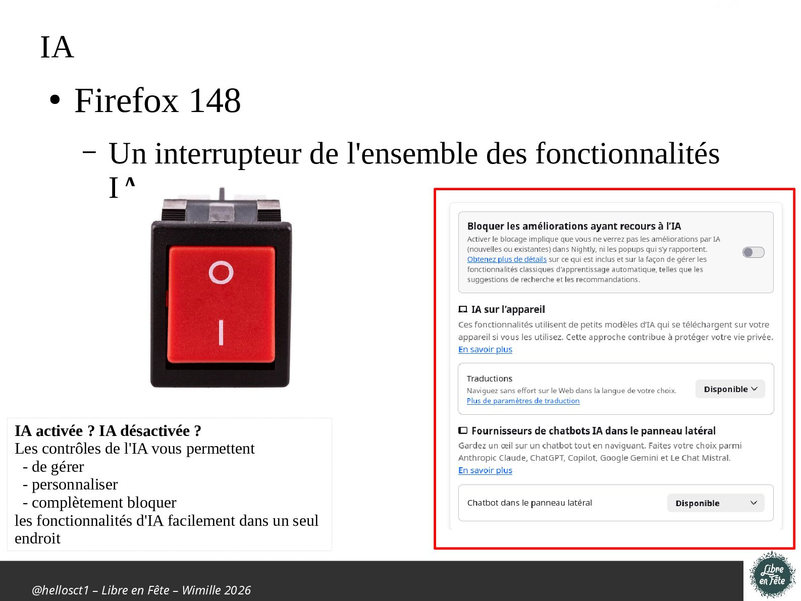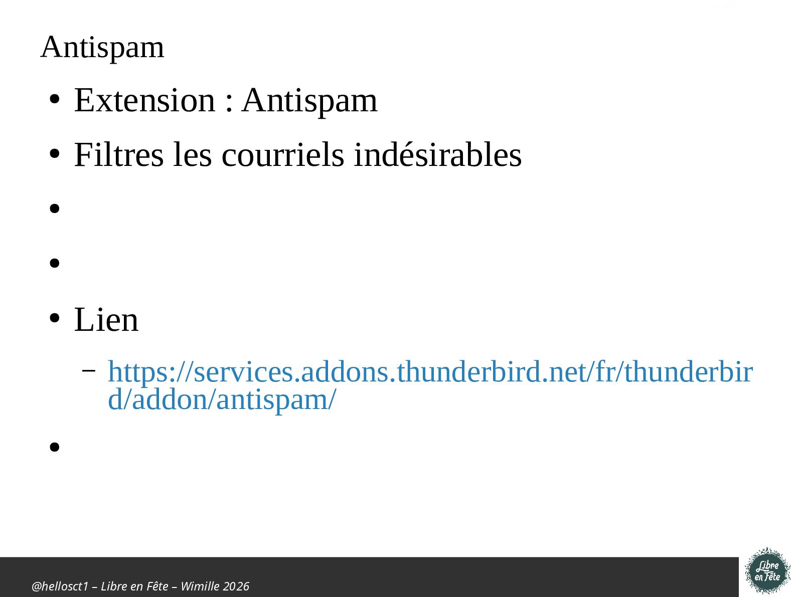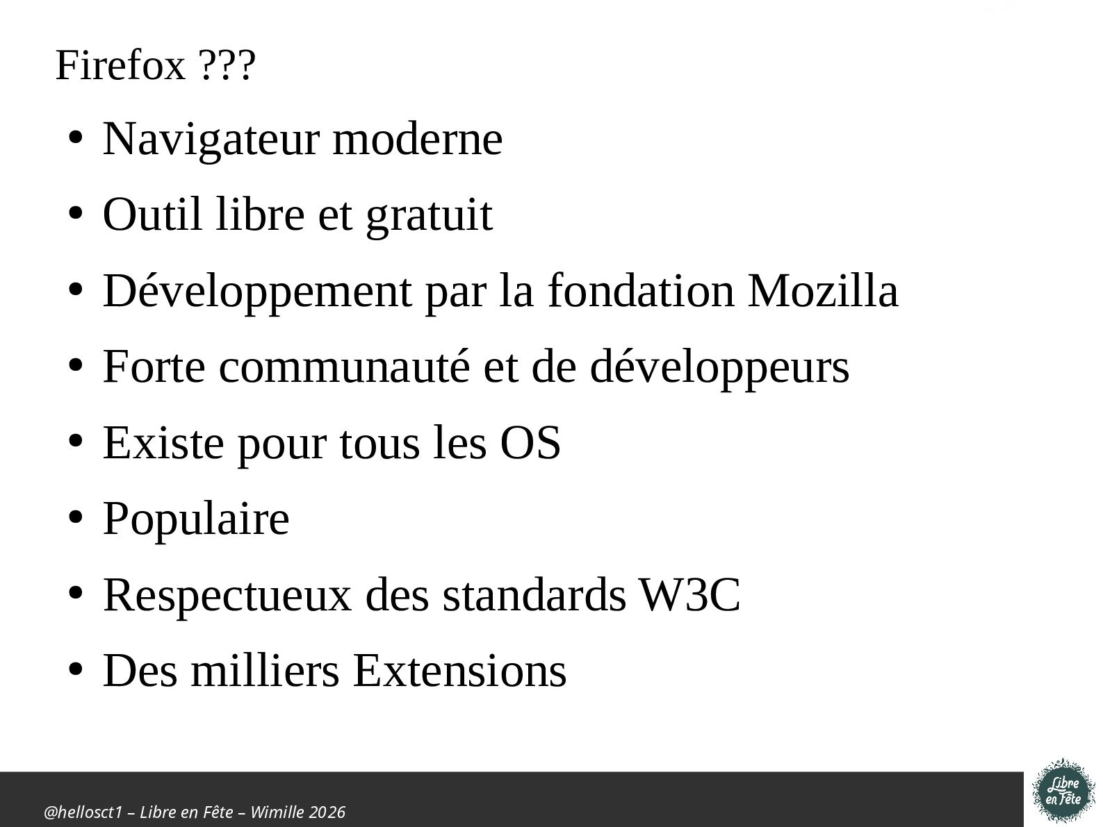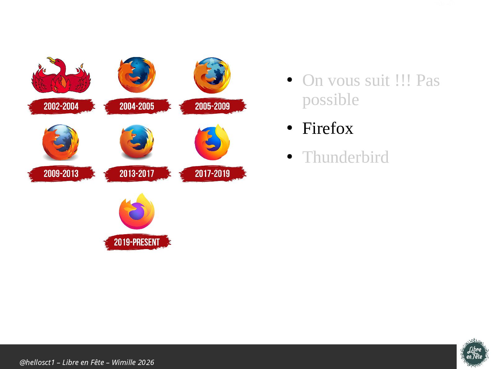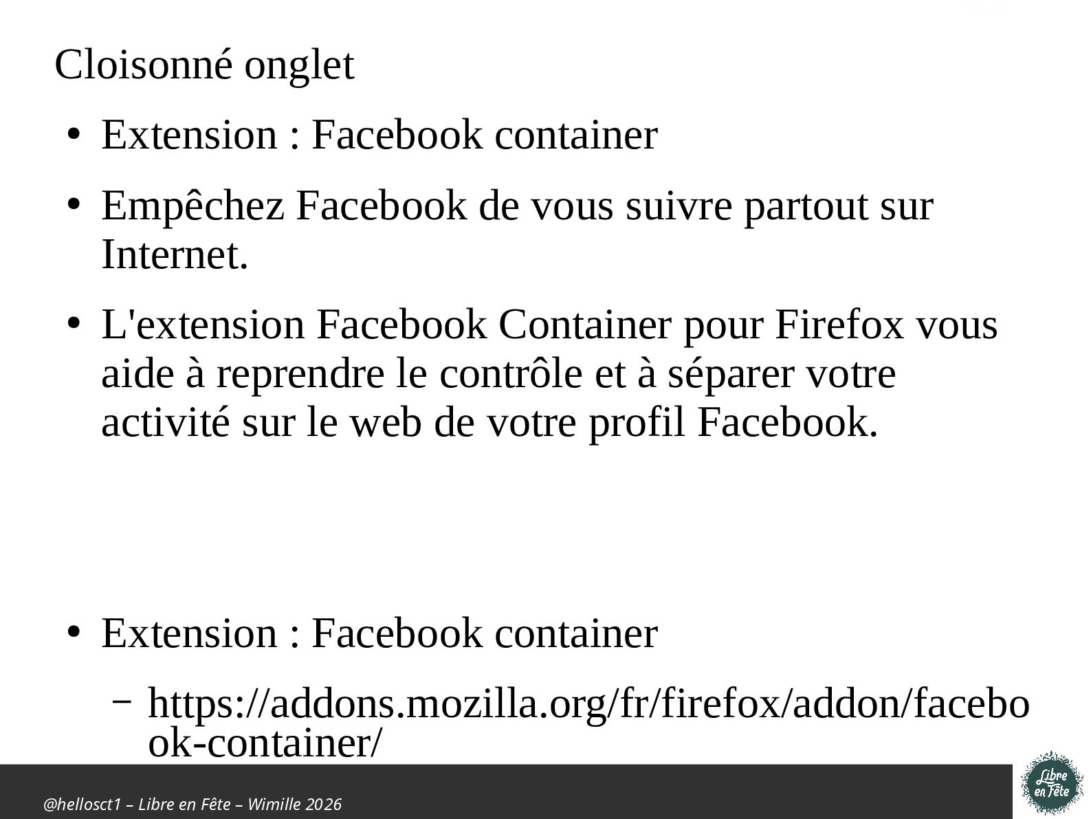 Présentation effectuée à Libre en fête 2026 à Wimille par Christophe Villeneuve sur "TIPS Firefox & Thunderbird".
