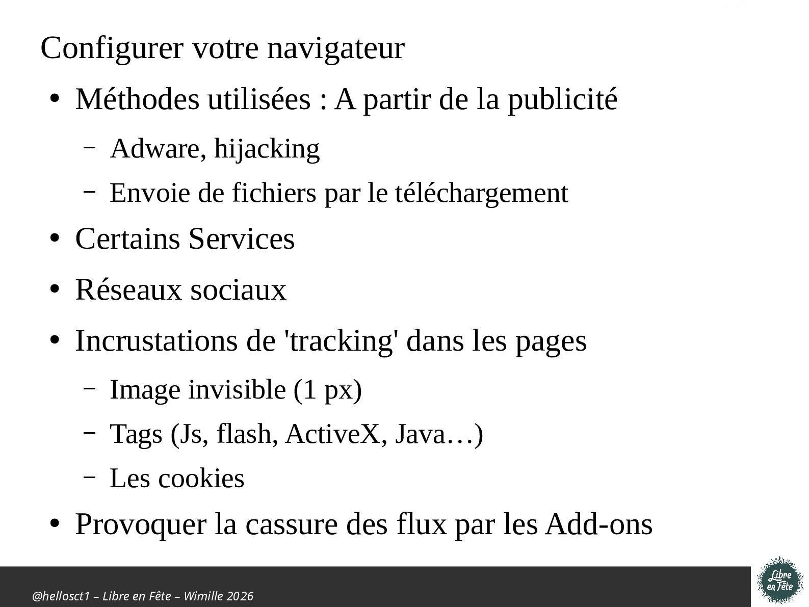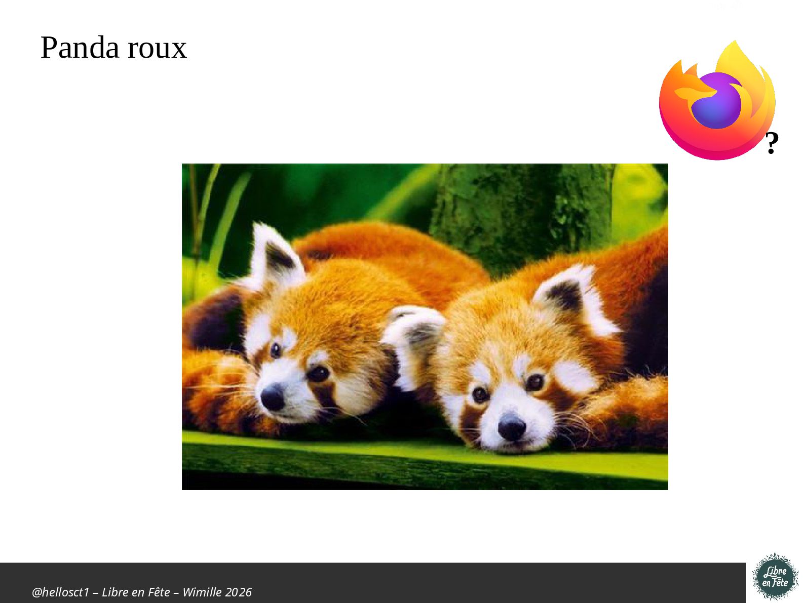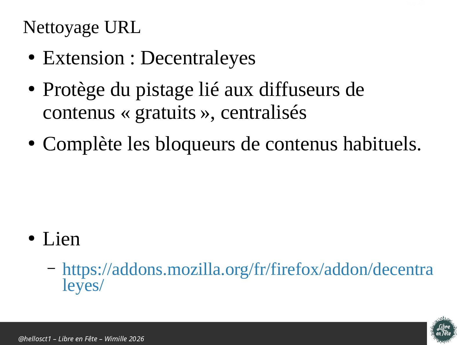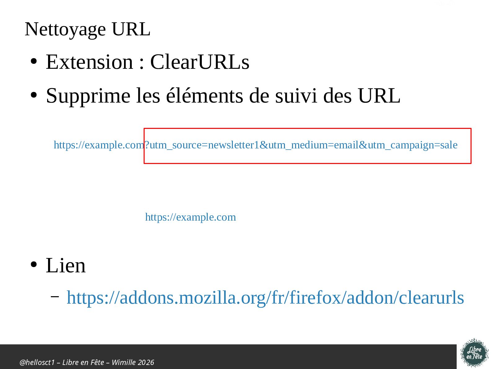 Présentation effectuée à Libre en fête 2026 à Wimille par Christophe Villeneuve sur "TIPS Firefox & Thunderbird".