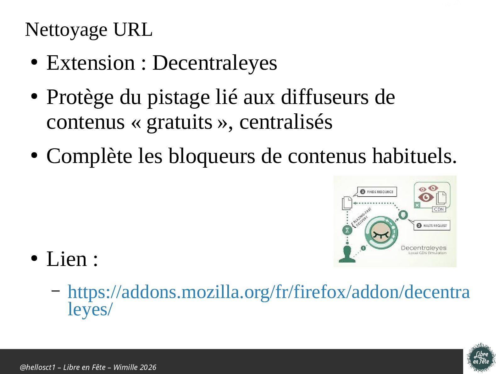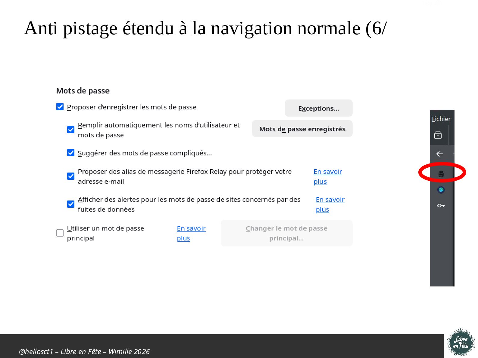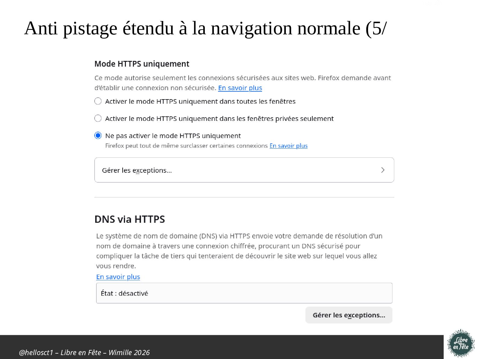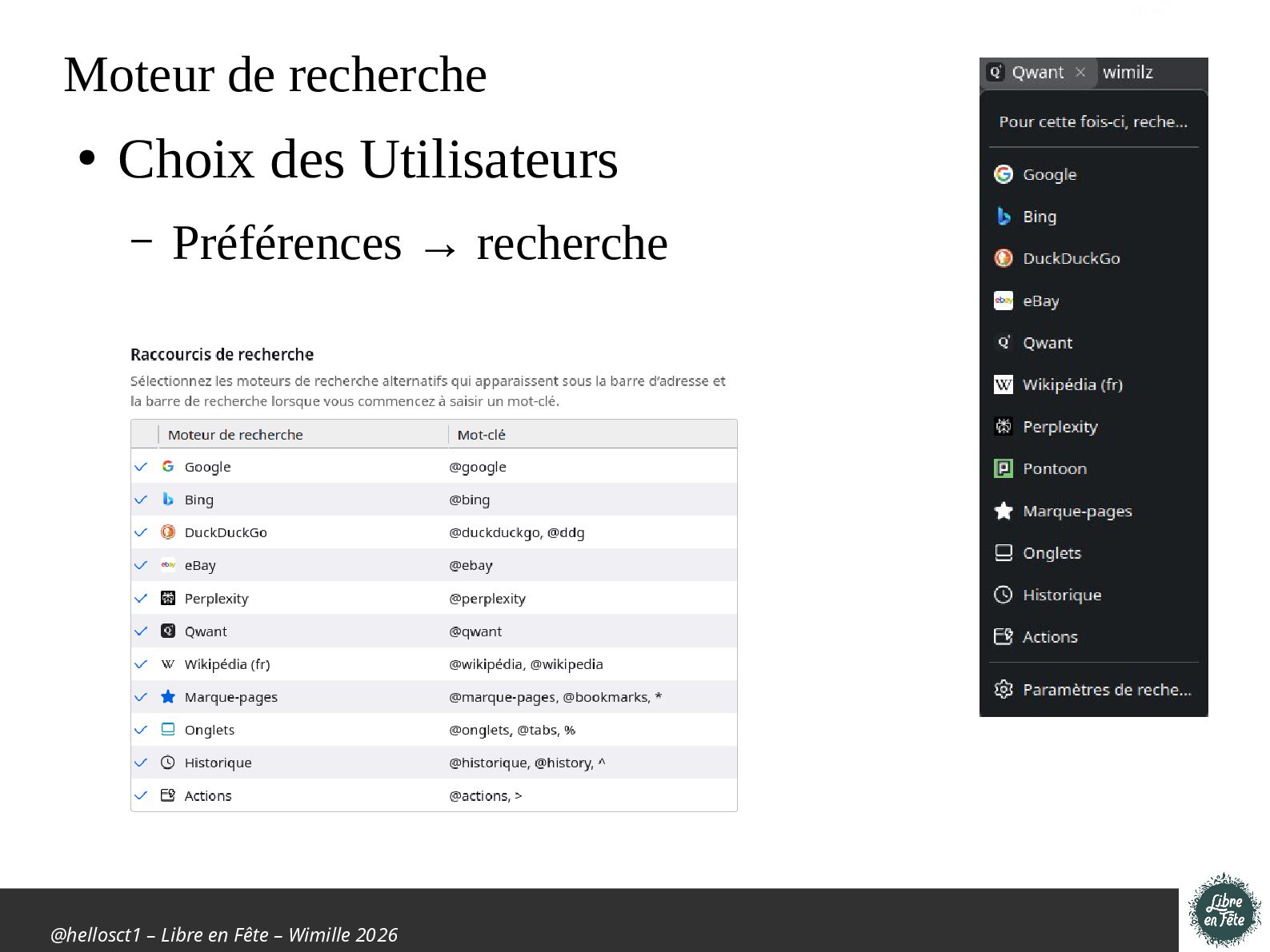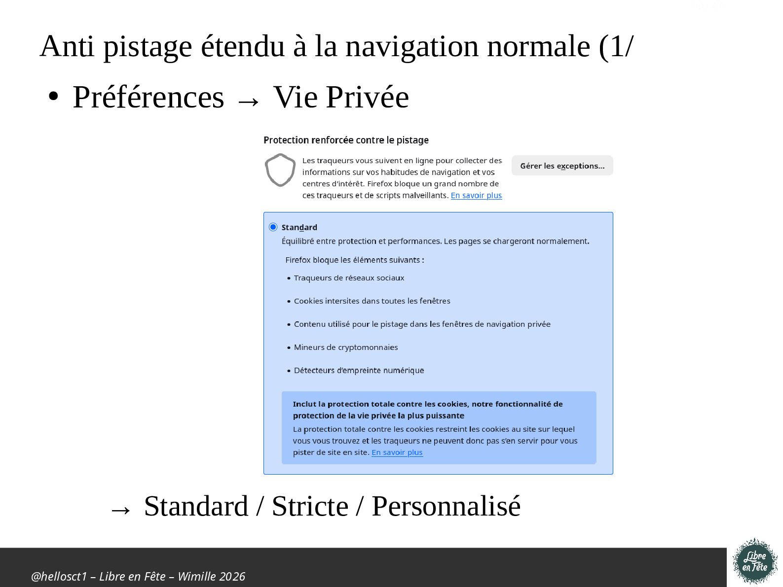 Présentation effectuée à Libre en fête 2026 à Wimille par Christophe Villeneuve sur "TIPS Firefox & Thunderbird".