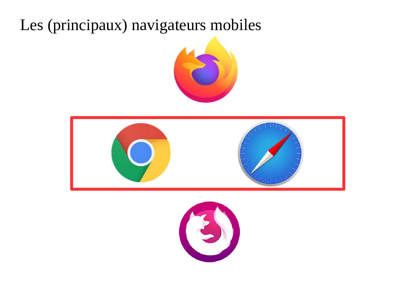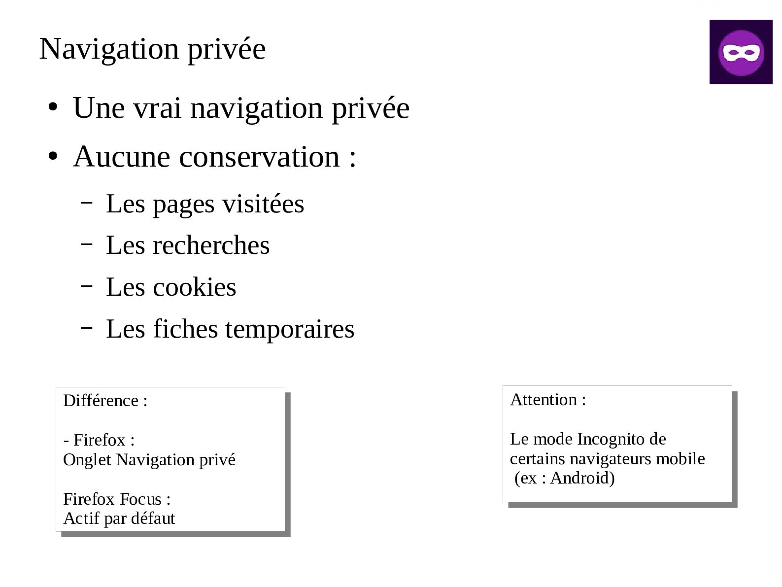 : – Les pages visitées – Les recherches – Les cookies – Les fiches temporaires Attention : Le mode Incognito de certains navigateurs mobile (ex : Android) Attention : Le mode Incognito de certains navigateurs mobile (ex : Android) Différence : - Firefox : Onglet Navigation privé Firefox Focus : Actif par défaut Différence : - Firefox : Onglet Navigation privé Firefox Focus : Actif par défaut