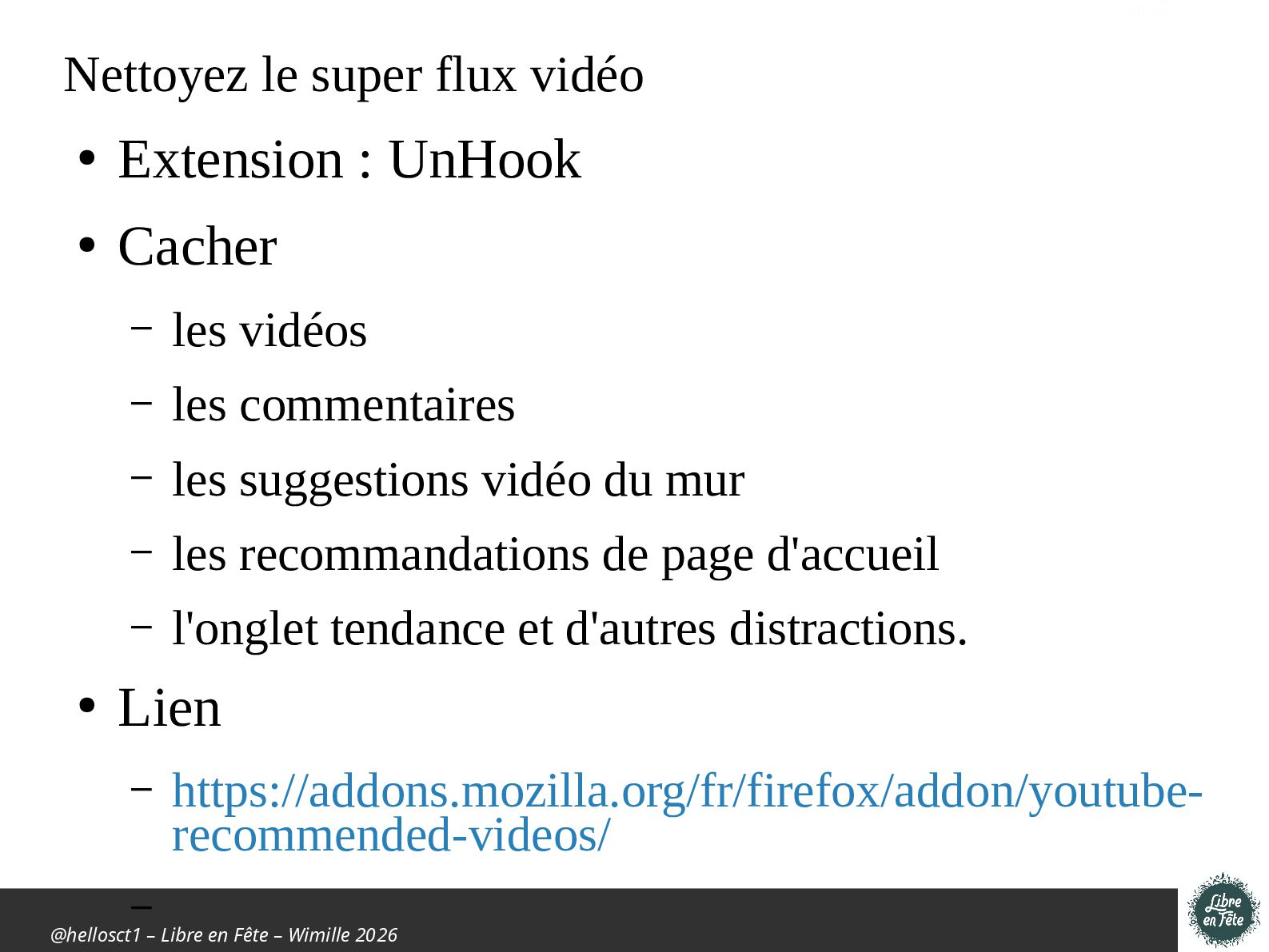 super flux vidéo • Extension : UnHook • Cacher – les vidéos – les commentaires – les suggestions vidéo du mur – les recommandations de page d'accueil – l'onglet tendance et d'autres distractions. • Lien – https://addons.mozilla.org/fr/firefox/addon/youtube- recommended-videos/ –