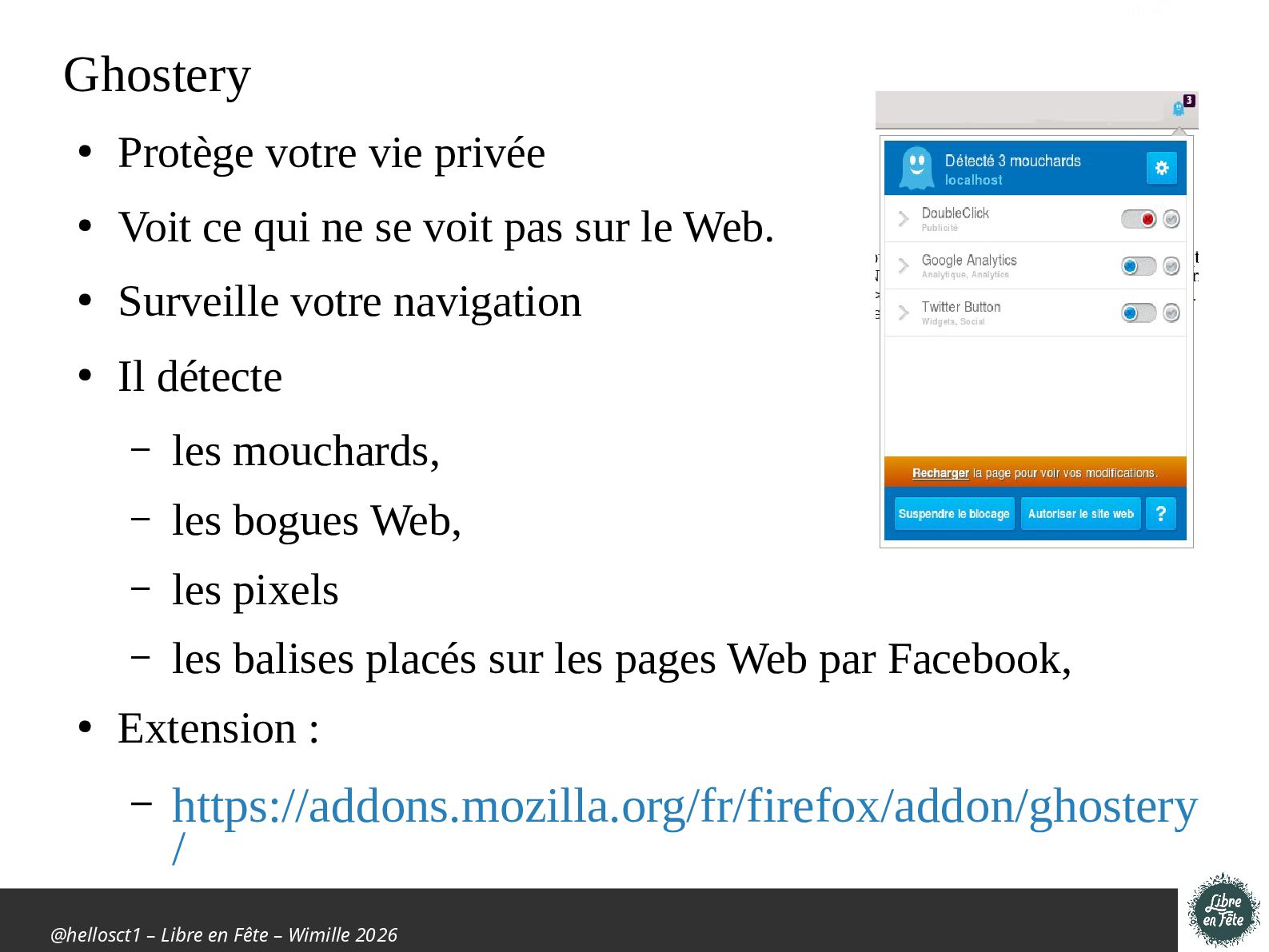 Protège votre vie privée • Voit ce qui ne se voit pas sur le Web. • Surveille votre navigation • Il détecte – les mouchards, – les bogues Web, – les pixels – les balises placés sur les pages Web par Facebook, • Extension : – https://addons.mozilla.org/fr/firefox/addon/ghostery /