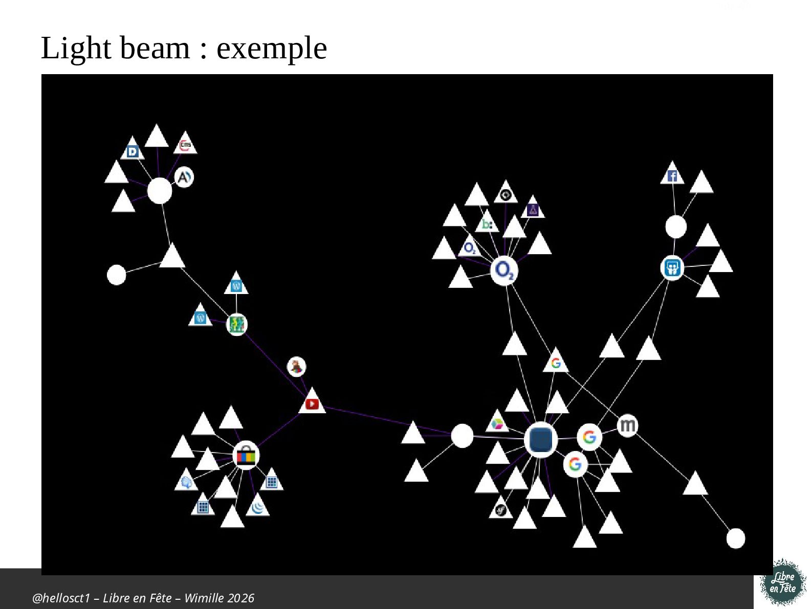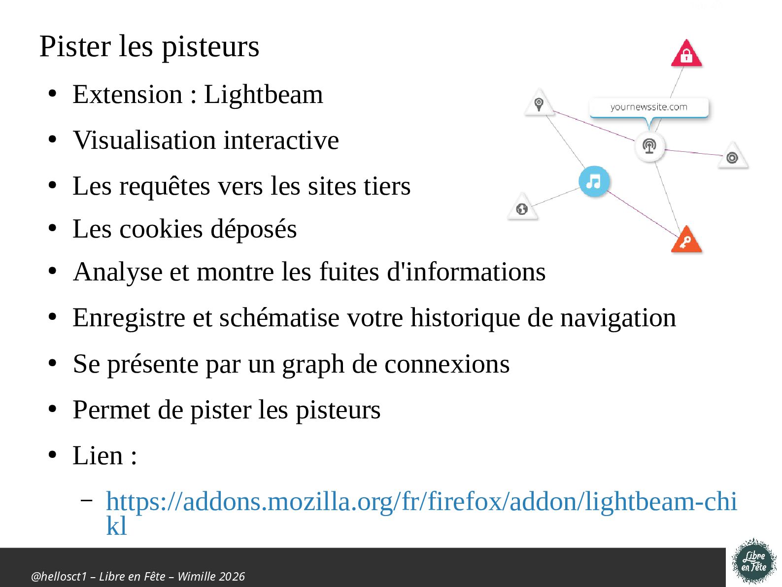 pisteurs • Extension : Lightbeam • Visualisation interactive • Les requêtes vers les sites tiers • Les cookies déposés • Analyse et montre les fuites d'informations • Enregistre et schématise votre historique de navigation • Se présente par un graph de connexions • Permet de pister les pisteurs • Lien : – https://addons.mozilla.org/fr/firefox/addon/lightbeam-chi kl