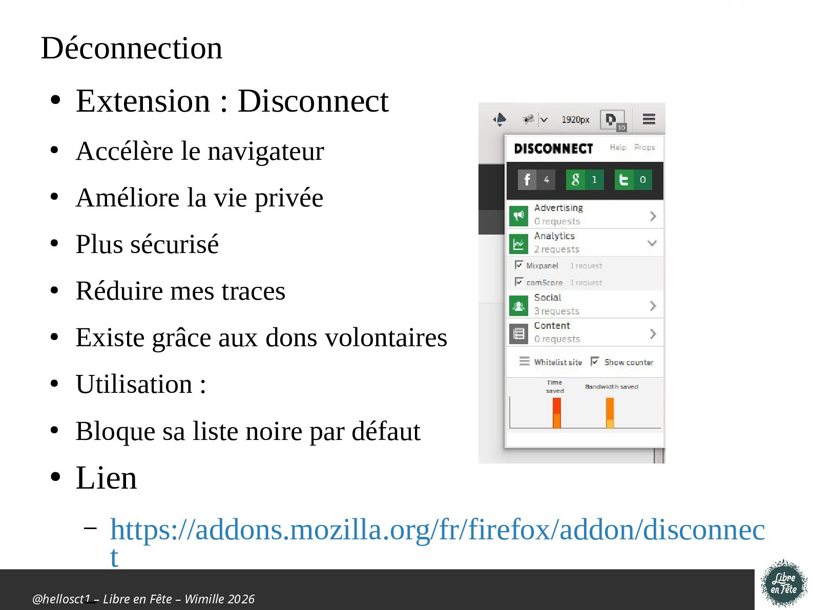 Extension : Disconnect • Accélère le navigateur • Améliore la vie privée • Plus sécurisé • Réduire mes traces • Existe grâce aux dons volontaires • Utilisation : • Bloque sa liste noire par défaut • Lien – https://addons.mozilla.org/fr/firefox/addon/disconnec t –