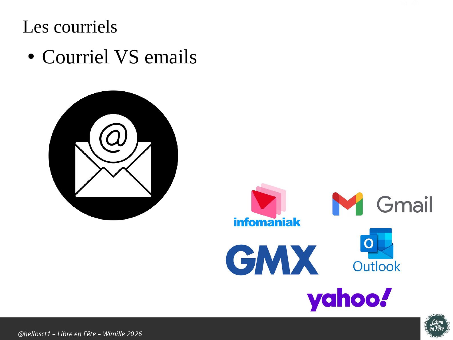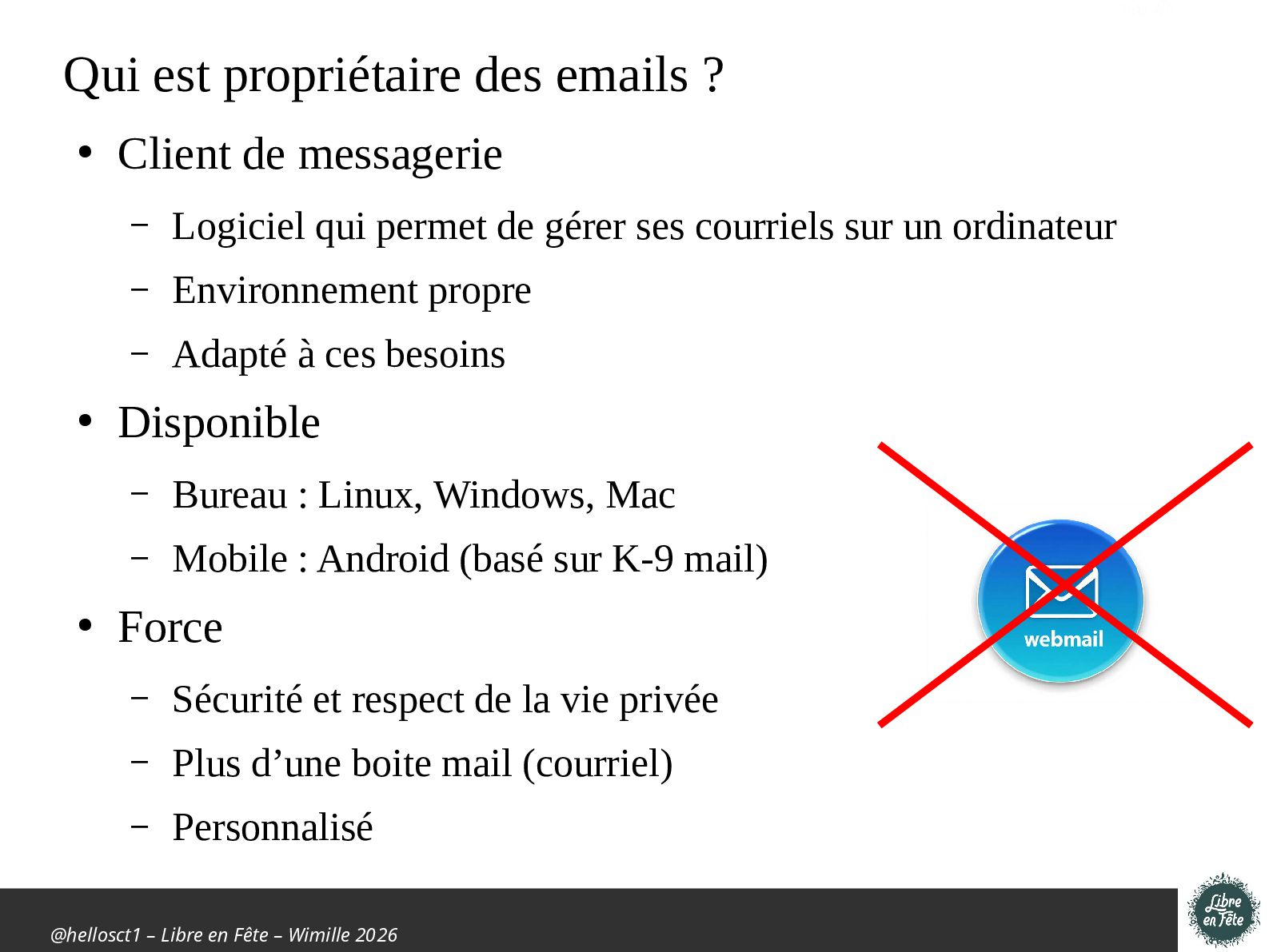 propriétaire des emails ? • Client de messagerie – Logiciel qui permet de gérer ses courriels sur un ordinateur – Environnement propre – Adapté à ces besoins • Disponible – Bureau : Linux, Windows, Mac – Mobile : Android (basé sur K-9 mail) • Force – Sécurité et respect de la vie privée – Plus d’une boite mail (courriel) – Personnalisé