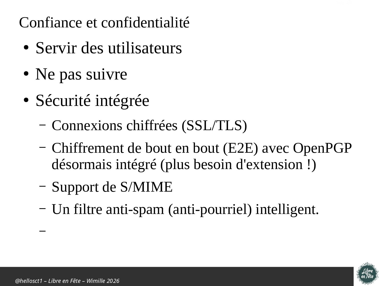 confidentialité • Servir des utilisateurs • Ne pas suivre • Sécurité intégrée – Connexions chiffrées (SSL/TLS) – Chiffrement de bout en bout (E2E) avec OpenPGP désormais intégré (plus besoin d'extension !) – Support de S/MIME – Un filtre anti-spam (anti-pourriel) intelligent. –