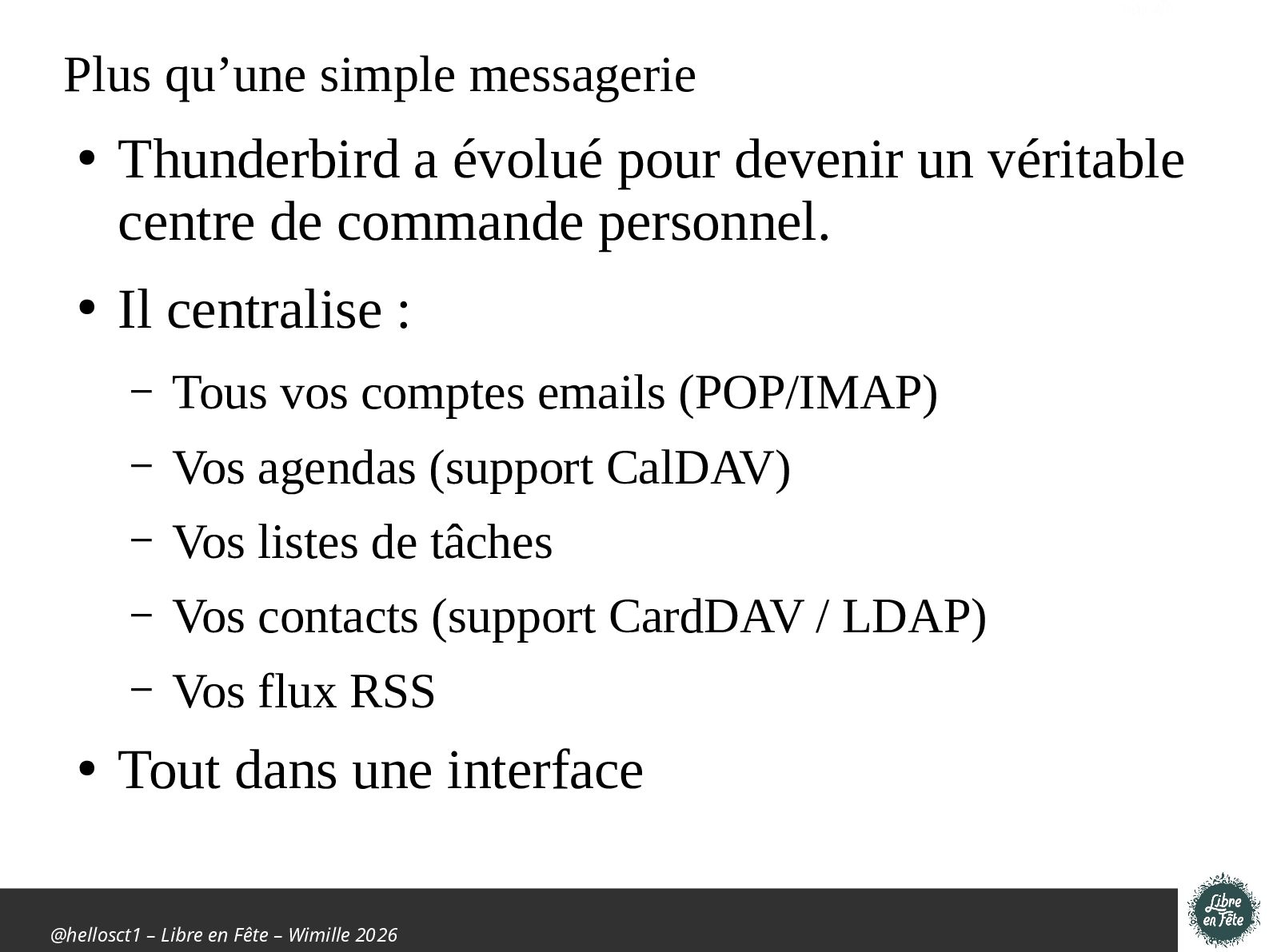 simple messagerie • Thunderbird a évolué pour devenir un véritable centre de commande personnel. • Il centralise : – Tous vos comptes emails (POP/IMAP) – Vos agendas (support CalDAV) – Vos listes de tâches – Vos contacts (support CardDAV / LDAP) – Vos flux RSS • Tout dans une interface