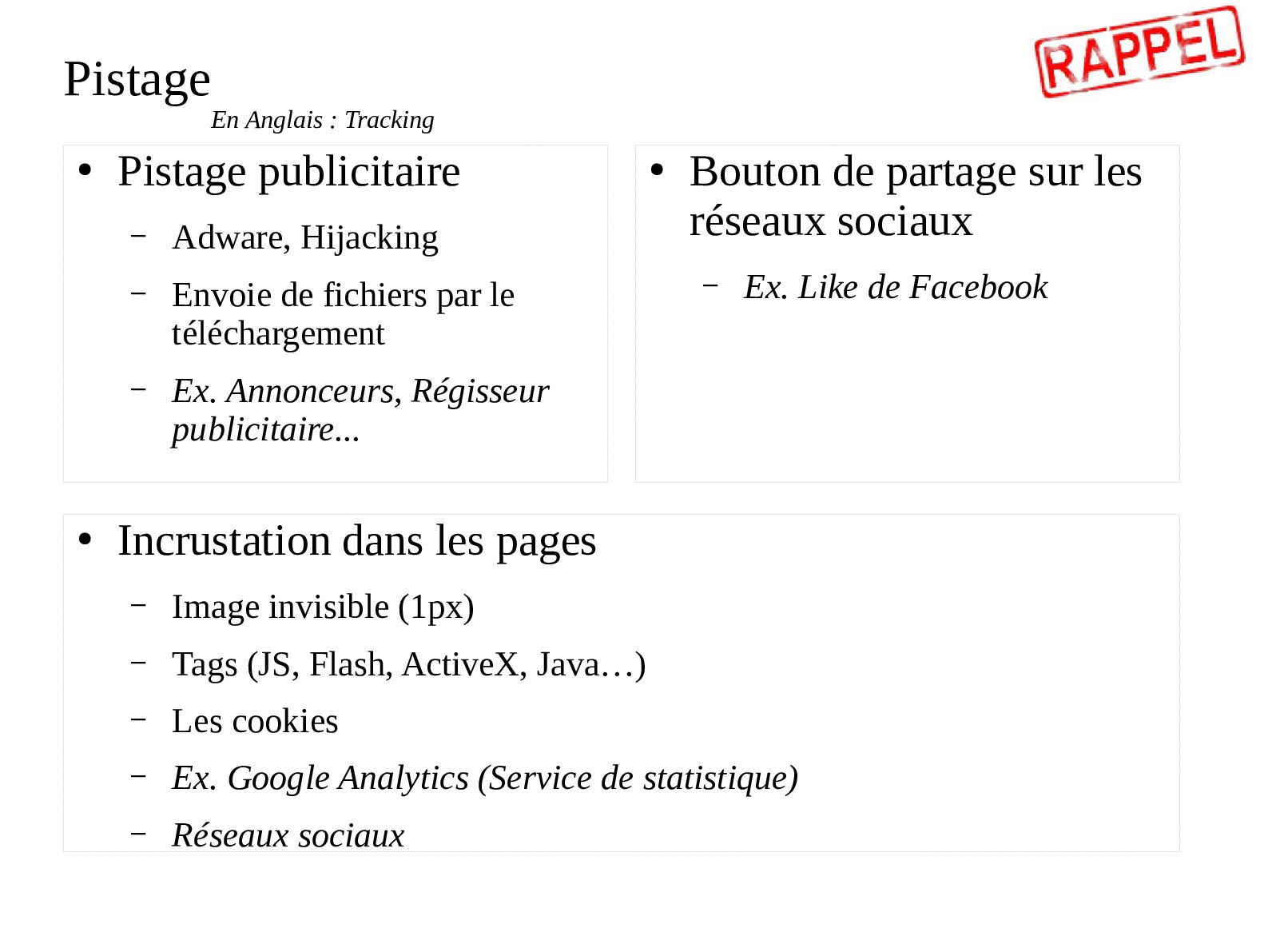 fichiers par le téléchargement – Ex. Annonceurs, Régisseur publicitaire... • Bouton de partage sur les réseaux sociaux – Ex. Like de Facebook • Incrustation dans les pages – Image invisible (1px) – Tags (JS, Flash, ActiveX, Java…) – Les cookies – Ex. Google Analytics (Service de statistique) – Réseaux sociaux En Anglais : Tracking
