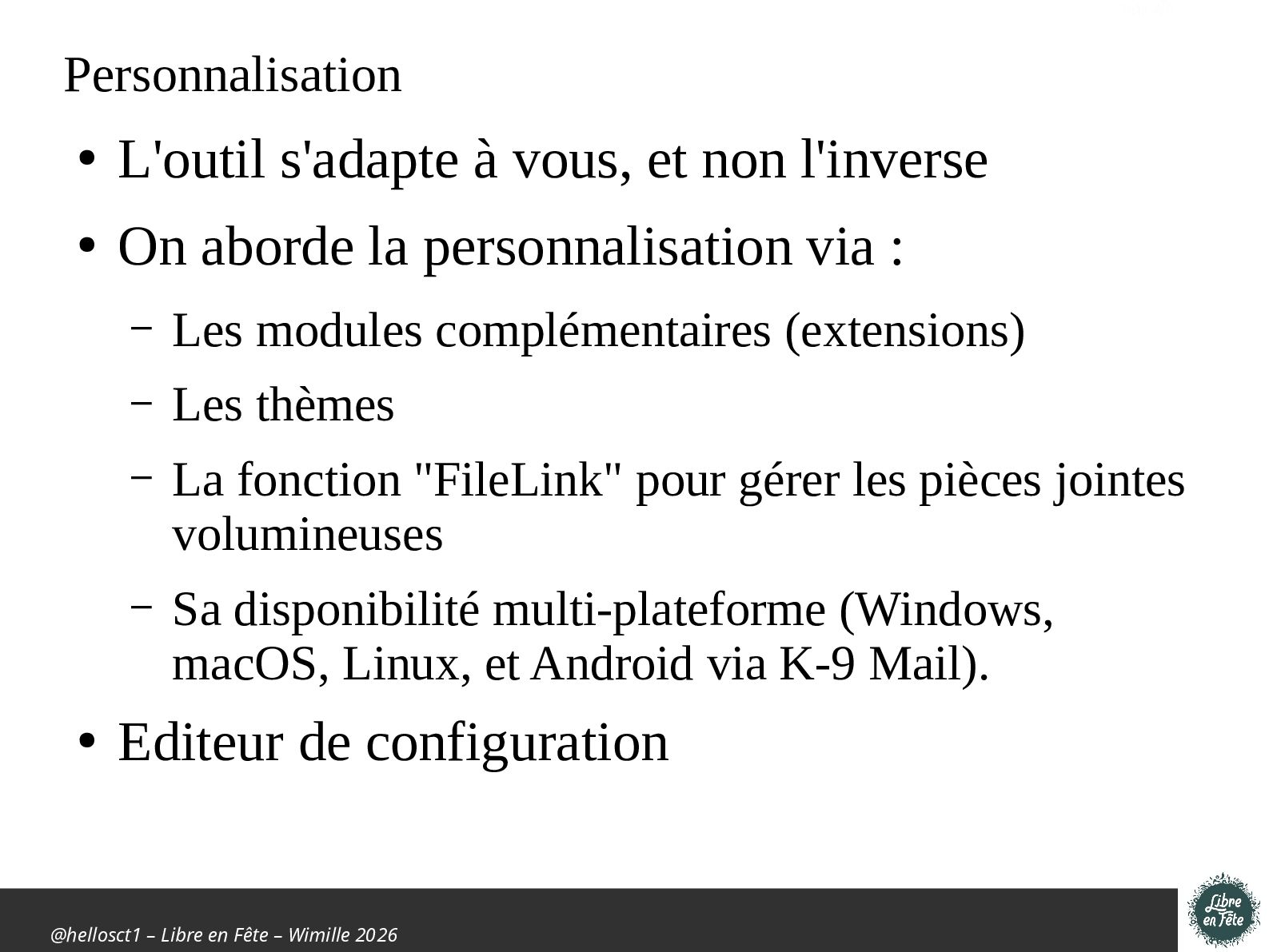 L'outil s'adapte à vous, et non l'inverse • On aborde la personnalisation via : – Les modules complémentaires (extensions) – Les thèmes – La fonction "FileLink" pour gérer les pièces jointes volumineuses – Sa disponibilité multi-plateforme (Windows, macOS, Linux, et Android via K-9 Mail). • Editeur de configuration