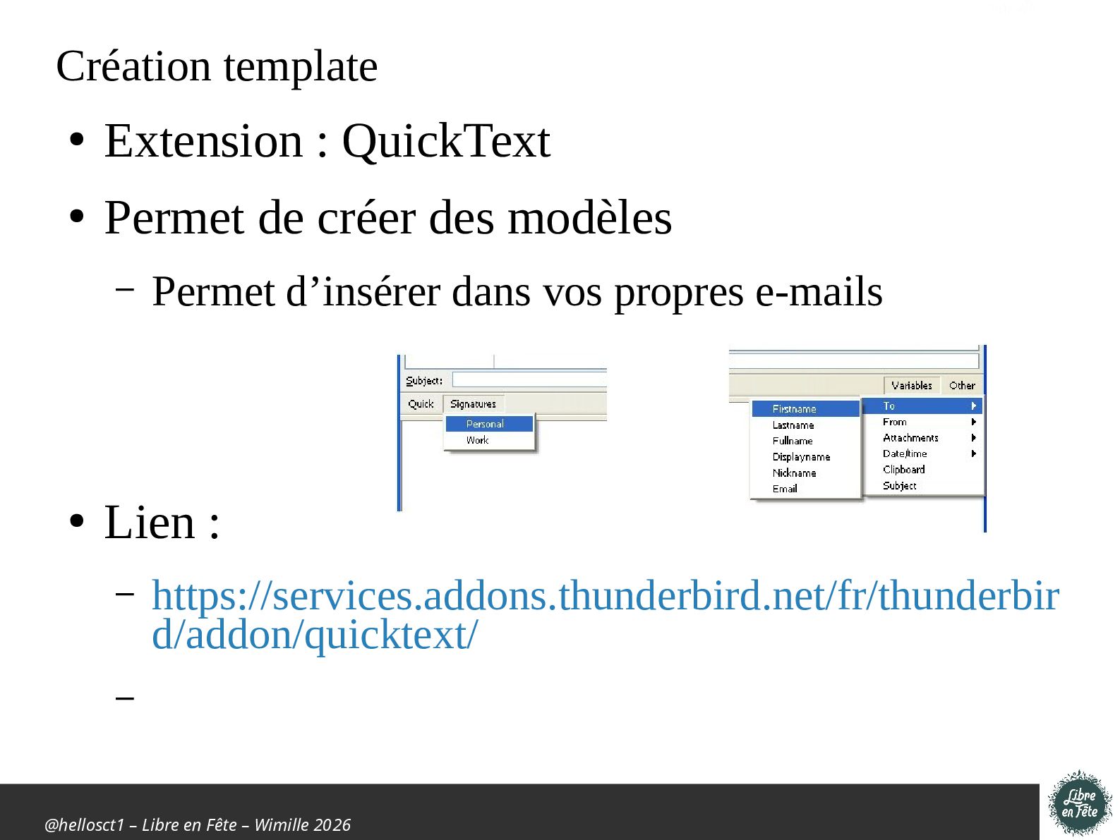 • Extension : QuickText • Permet de créer des modèles – Permet d’insérer dans vos propres e-mails • Lien : – https://services.addons.thunderbird.net/fr/thunderbir d/addon/quicktext/ –
