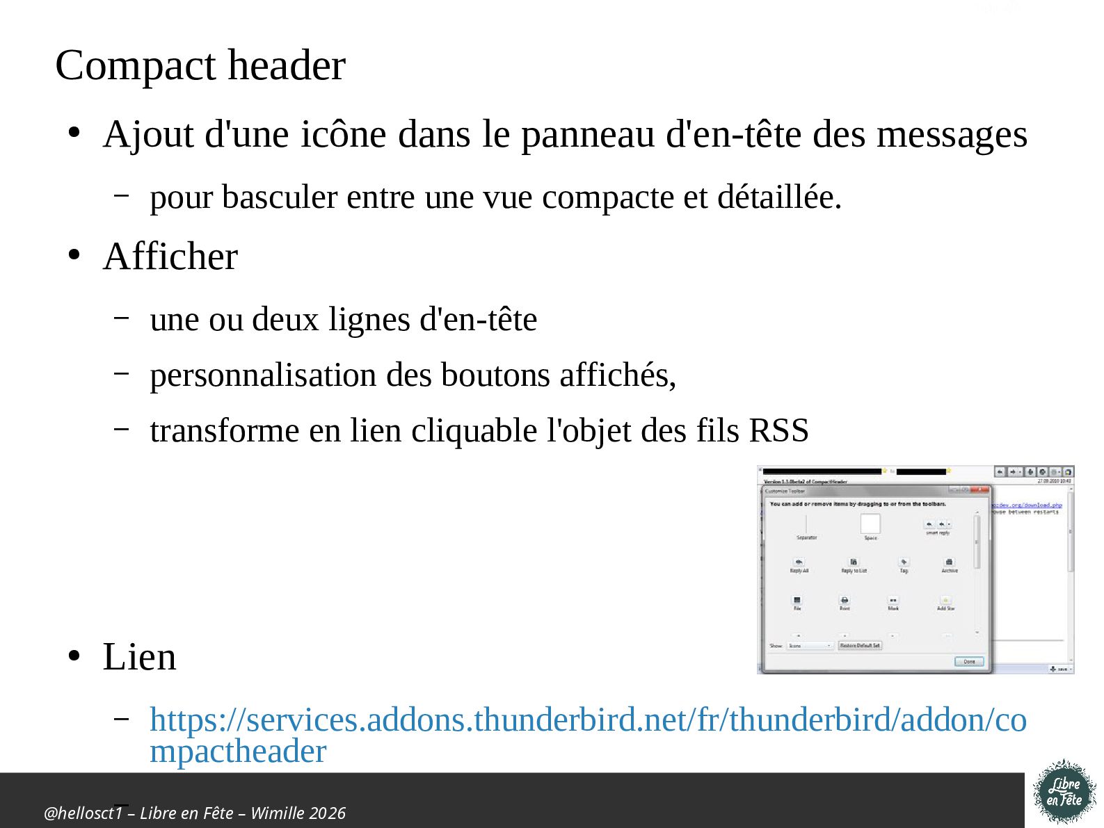 • Ajout d'une icône dans le panneau d'en-tête des messages – pour basculer entre une vue compacte et détaillée. • Afficher – une ou deux lignes d'en-tête – personnalisation des boutons affichés, – transforme en lien cliquable l'objet des fils RSS • Lien – https://services.addons.thunderbird.net/fr/thunderbird/addon/co mpactheader –
