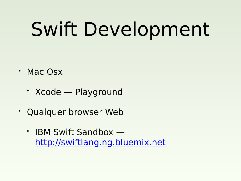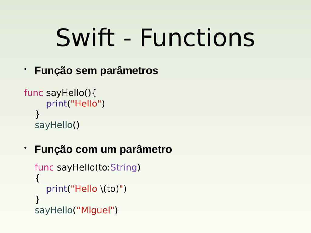String = "Uma String" let count : Int = 0 let π : Double = 3.14 let ok : Bool = true • Inferido let str = "Uma String" let count = 0 let π = 3.14 let ok = true