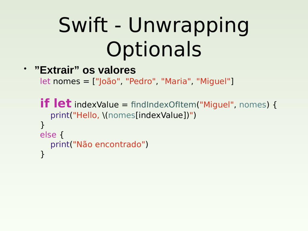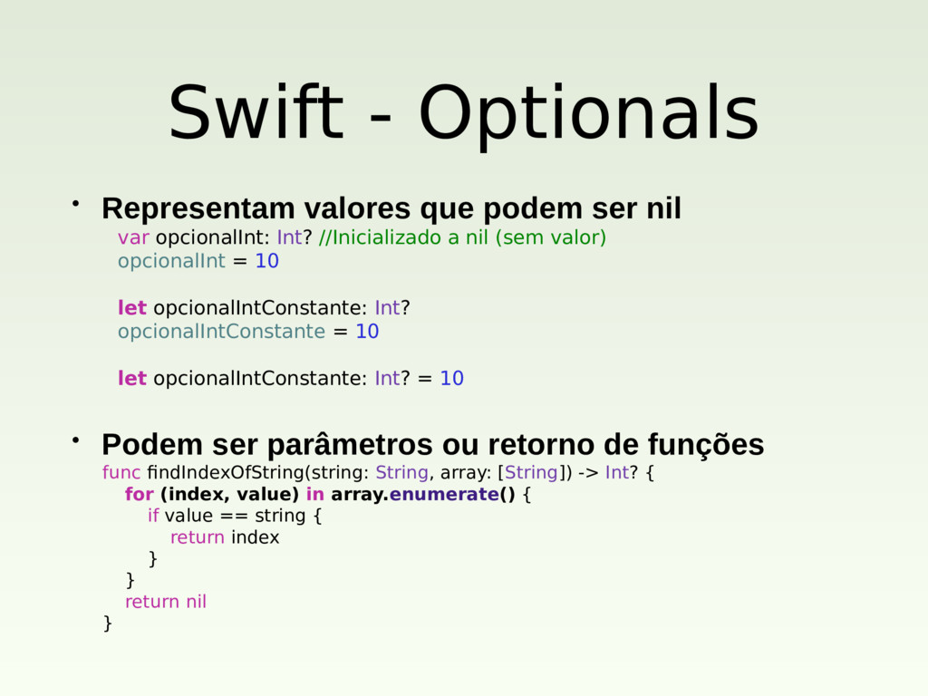 var opcionalInt: Int? //Inicializado a nil (sem valor) opcionalInt = 10 let opcionalIntConstante: Int? opcionalIntConstante = 10 let opcionalIntConstante: Int? = 10 • Podem ser parâmetros ou retorno de funções func findIndexOfString(string: String, array: [String]) -> Int? { for (index, value) in array.enumerate() { if value == string { return index } } return nil }