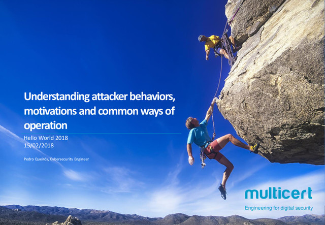 • CyberSecurity Intelligence Center manager • mSecurity project manager PREVIOUS EXPERIENCE: • System Administrator at Multicert, S.A. • System Administrator at Noesis • System Administrator at Sobatlantic, LDA. PROJECTS: • Involved in several international projects, as the Electronic Vote for the International Red Cross and the implementation of the PKI system supporting the Electronic Prescription Platform at Greece. • Design and implementation of the Cybersecurity Intelligence Center at Multicert. • Responsible for several pentest and security projects. PEDRO QUEIRÓS CYBERSECURITY ENGINEER PROFESSIONAL EXPERIENCE ACADEMIC EXPERIENCE AND OTHERS • Post-graduate in Cibersecurity and Ciberdefense • Universidade do Minho and Academia Militar • Master’s in Network Communications Engineering • Universidade do Minho • Author of several articles and presentations about Cybersecurity. • Author of the scientific article "Solução Aberta para uma Rede de Sondas de QoS na RCTS", presented at CRC 2013. • Author of the scientific article "Open Architecture for Quality of Service Monitoring at a National Research and Education Network", published at Information Sciences and Systems 2014 / Springer. Hello World 2018 – MULTICERT – February 15th, 2018