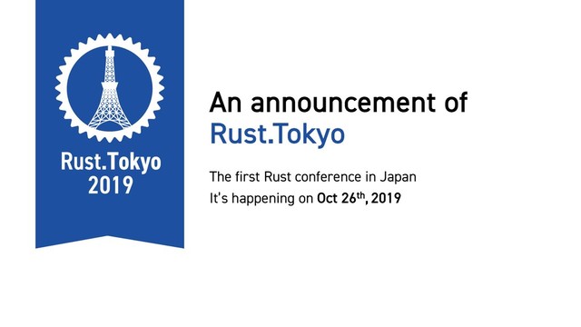 Rust.Tokyo 開催に関するお知らせです.2019年10月26日 (土) に Rust.Tokyo という,日本では初開催となる Rust 言語に関するカンファレンスを開催します.詳細は https://rust.tokyo/ あるいは Twitter アカウント @rustlang_tokyo にて.