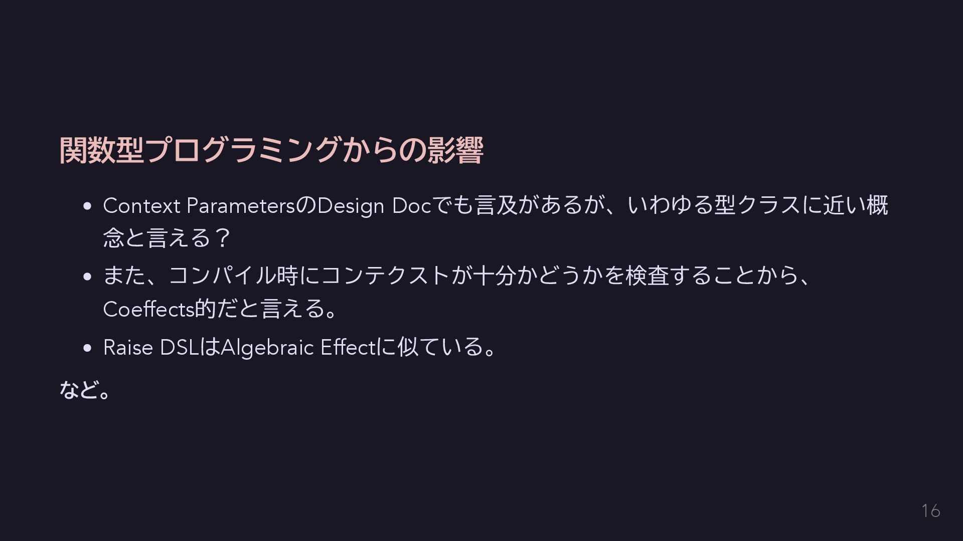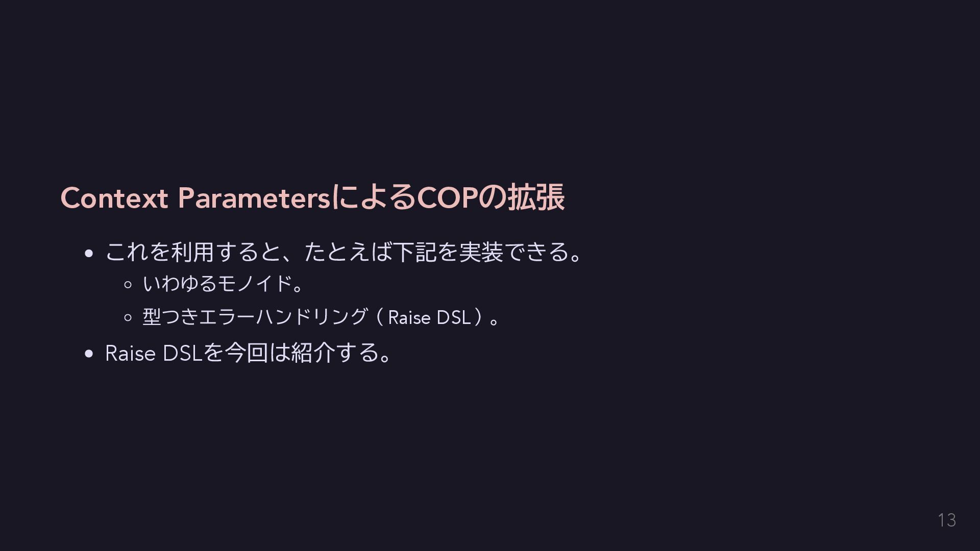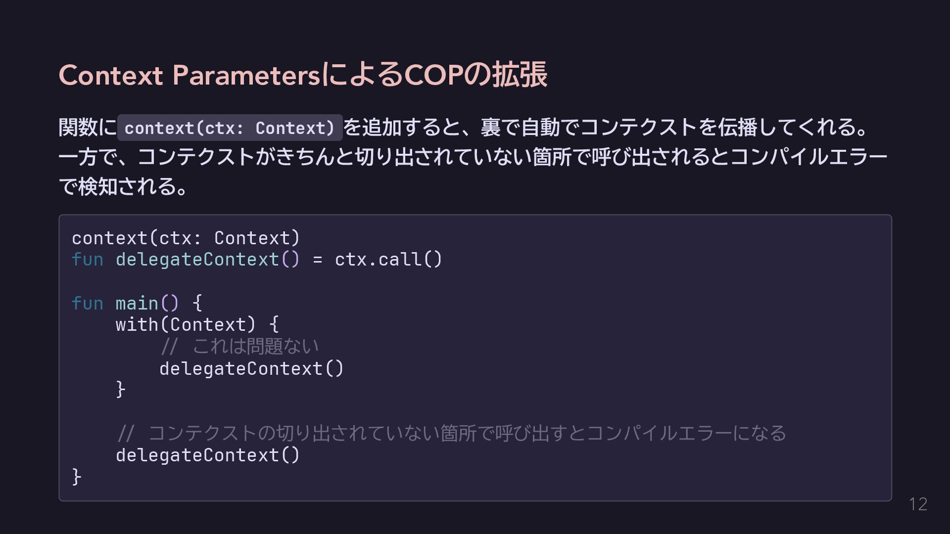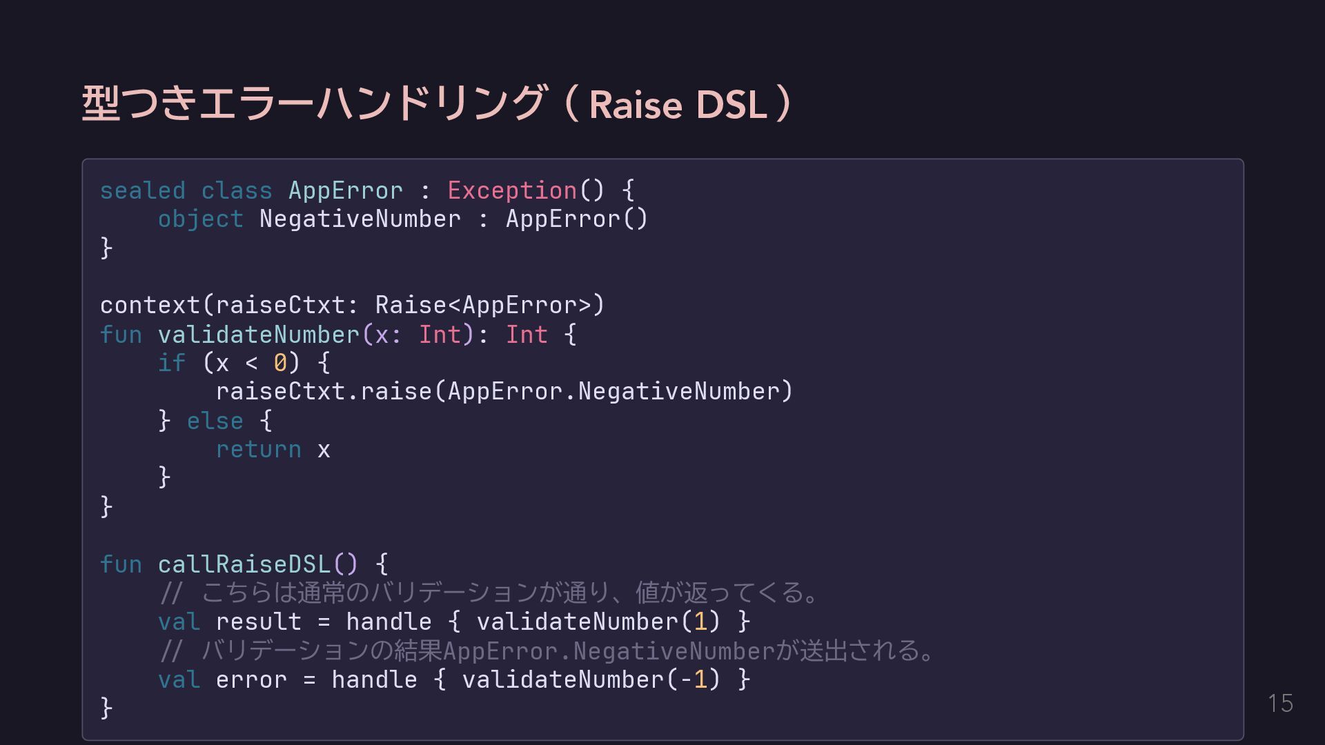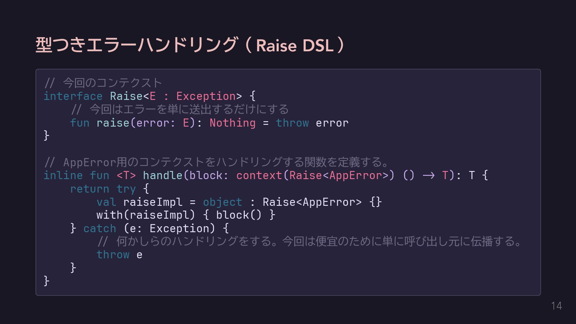 今回はエラーを単に送出するだけにする fun raise(error: E): Nothing = throw error } // AppError用のコンテクストをハンドリングする関数を定義する。 inline fun <T> handle(block: context(Raise<AppError>) () -> T): T { return try { val raiseImpl = object : Raise<AppError> {} with(raiseImpl) { block() } } catch (e: Exception) { // 何かしらのハンドリングをする。今回は便宜のために単に呼び出し元に伝播する。 throw e } } 14