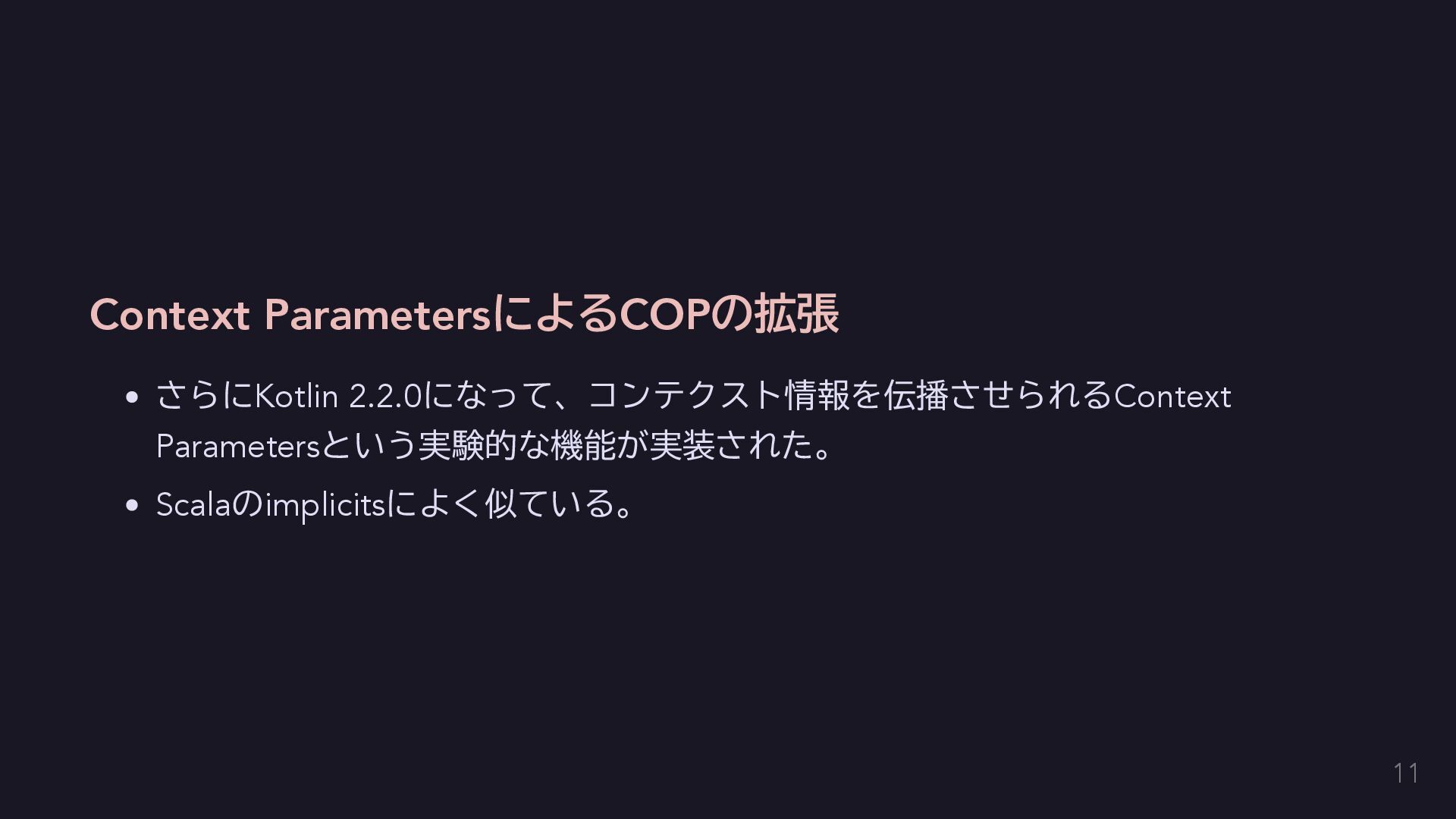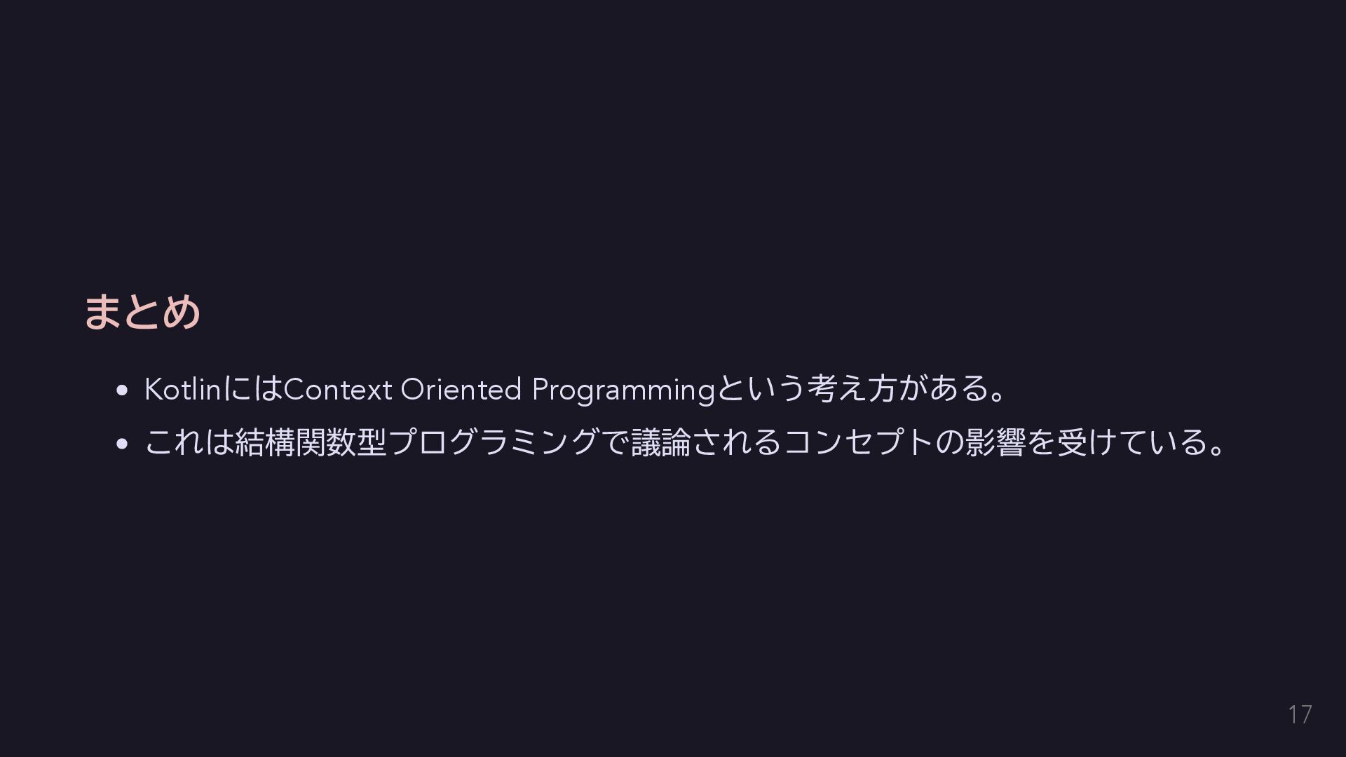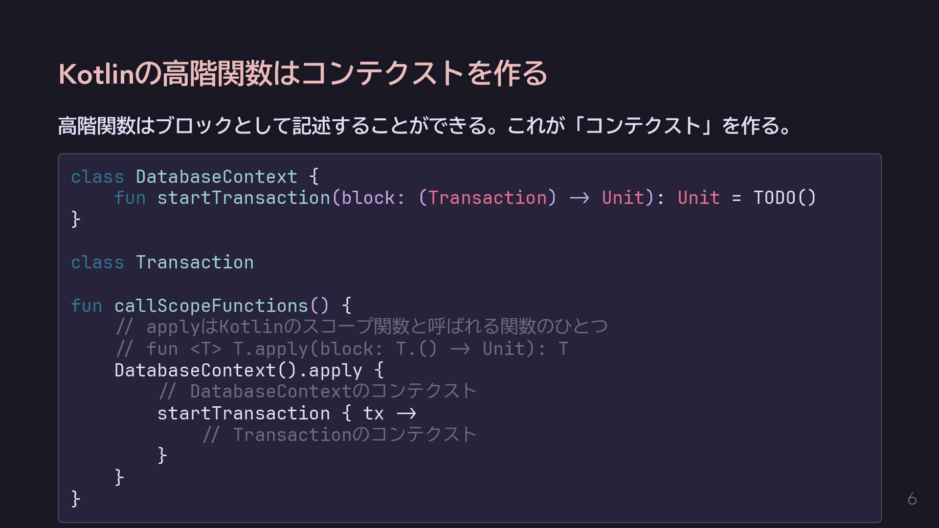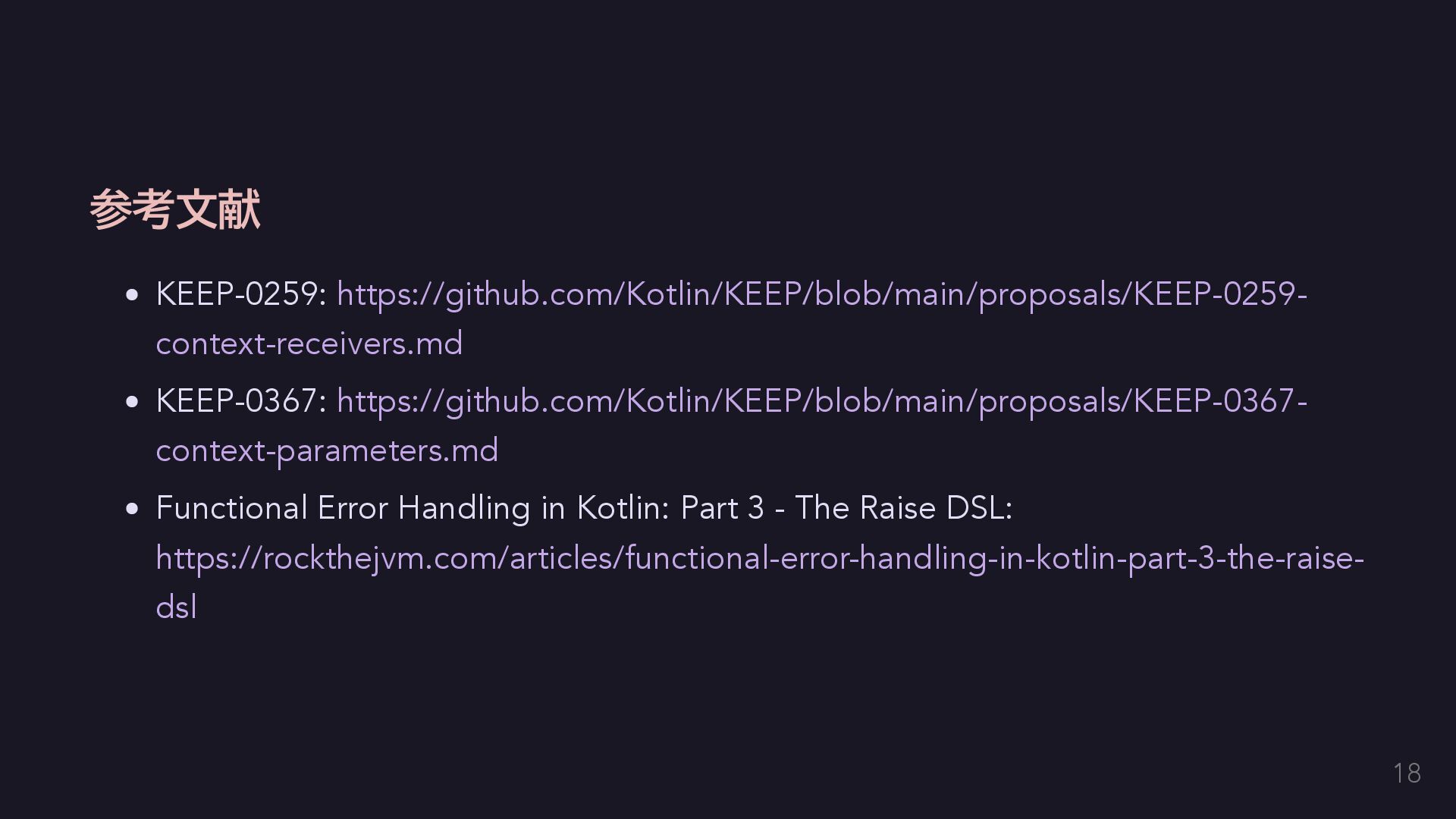 今回はエラーを単に送出するだけにする fun raise(error: E): Nothing = throw error } // AppError用のコンテクストをハンドリングする関数を定義する。 inline fun <T> handle(block: context(Raise<AppError>) () -> T): T { return try { val raiseImpl = object : Raise<AppError> {} with(raiseImpl) { block() } } catch (e: Exception) { // 何かしらのハンドリングをする。今回は便宜のために単に呼び出し元に伝播する。 throw e } } 14