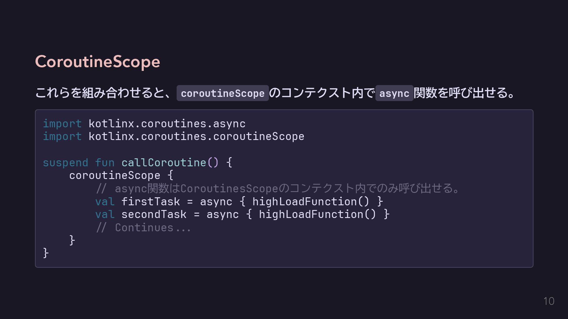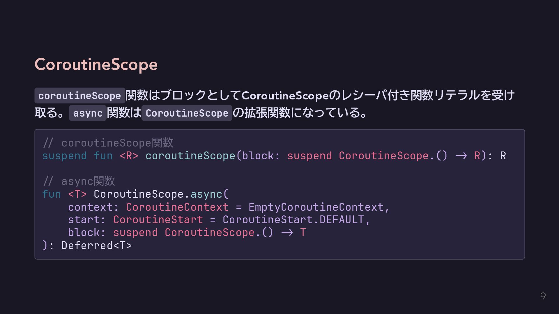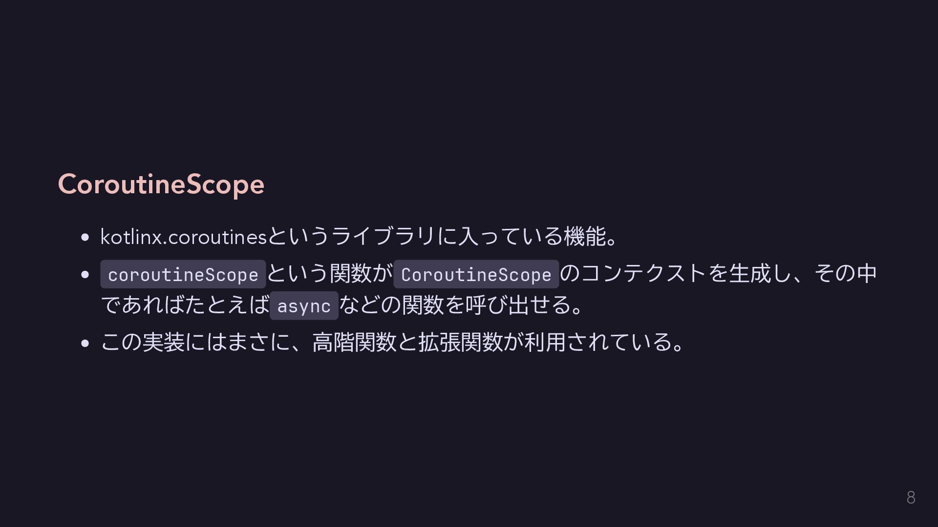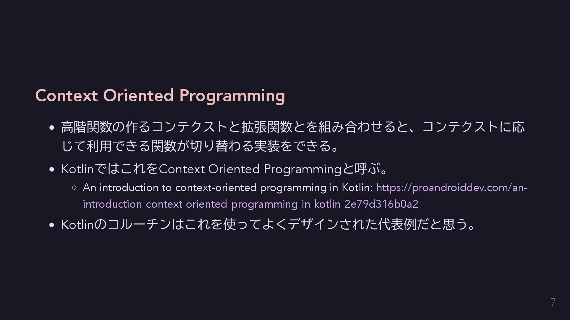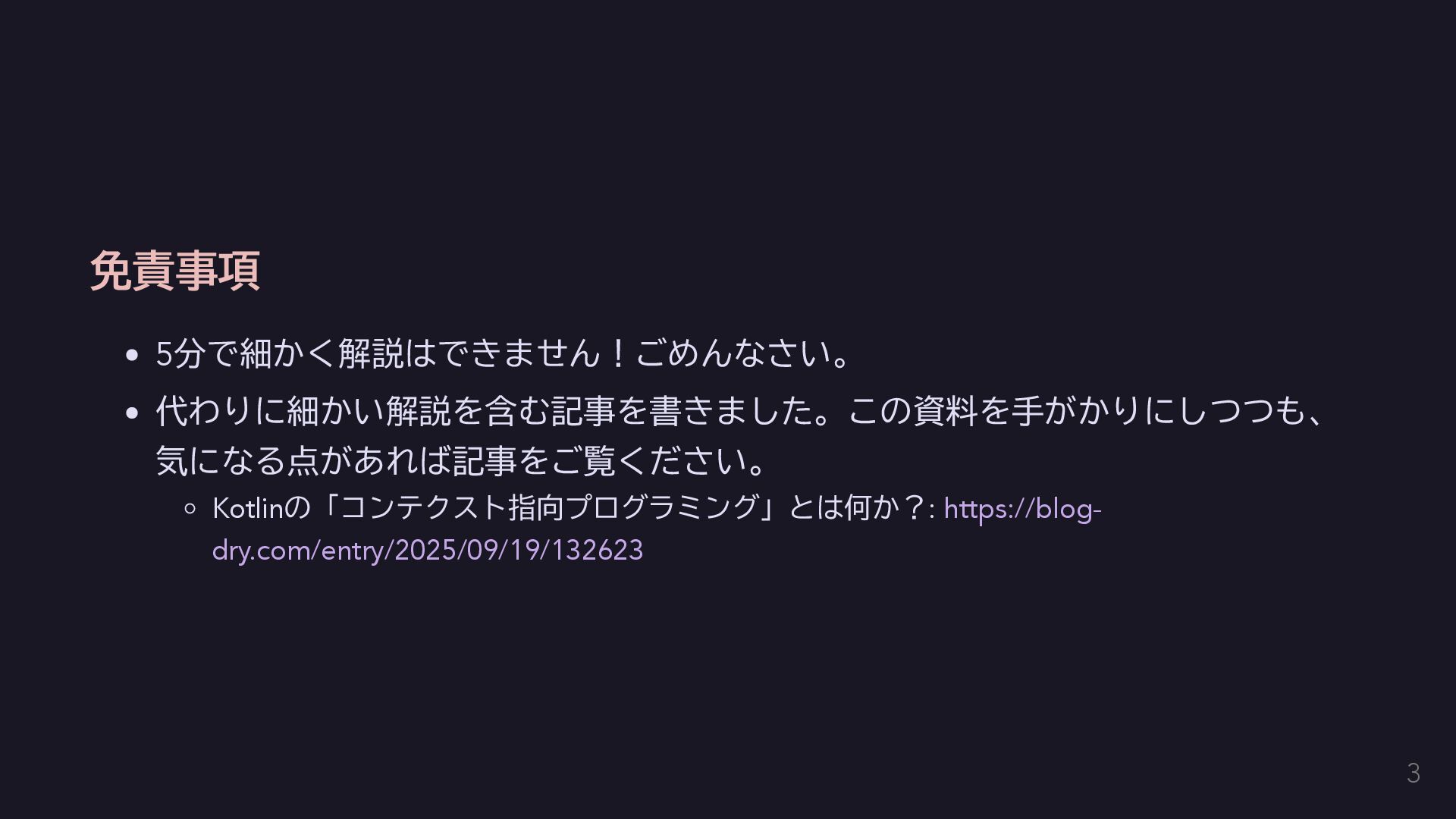 今回はエラーを単に送出するだけにする fun raise(error: E): Nothing = throw error } // AppError用のコンテクストをハンドリングする関数を定義する。 inline fun <T> handle(block: context(Raise<AppError>) () -> T): T { return try { val raiseImpl = object : Raise<AppError> {} with(raiseImpl) { block() } } catch (e: Exception) { // 何かしらのハンドリングをする。今回は便宜のために単に呼び出し元に伝播する。 throw e } } 14