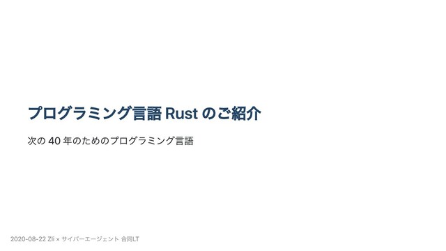 Linux への導⼊の噂。 Rust Foundation の設⽴を 2020 年中に⾏うことが発表された。 Rust は次の 40 年のための⾔語 Rust: A Language for the Next 40 Years - Carol Nichols https://www.youtube.com/watch?v=A3AdN7U24iU 2020-08-22 Zli × サイバーエージェント 合同LT