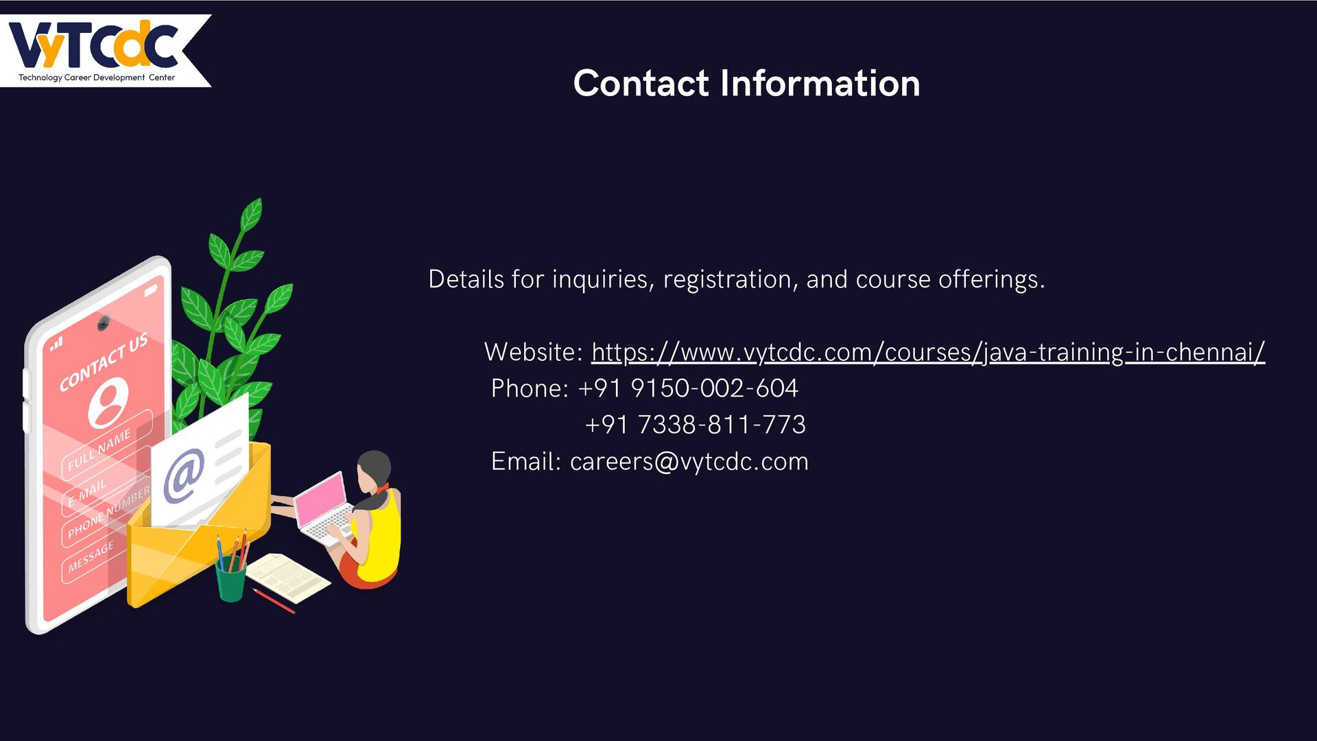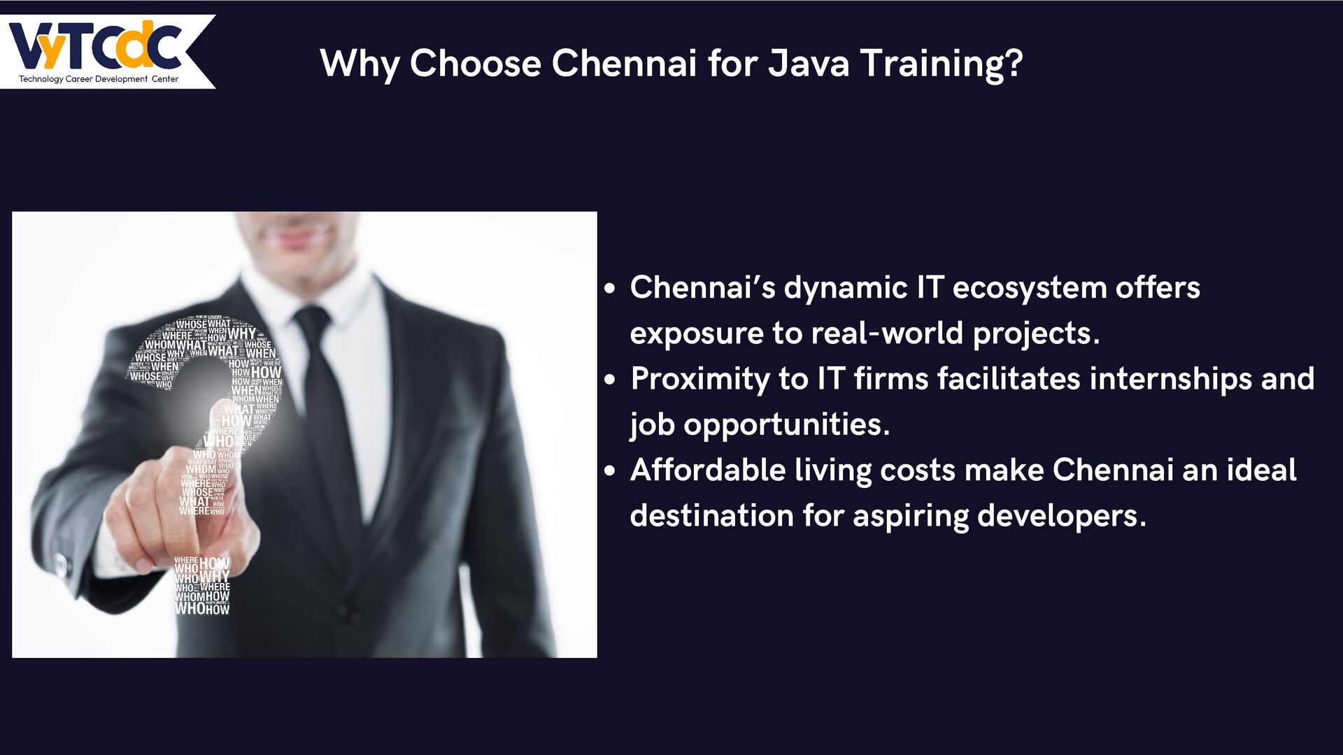 Excel in Java development with VyTCDC's Java training in Chennai. Our program equips you with the necessary skills and knowledge to thrive in various job roles in the software development industry.