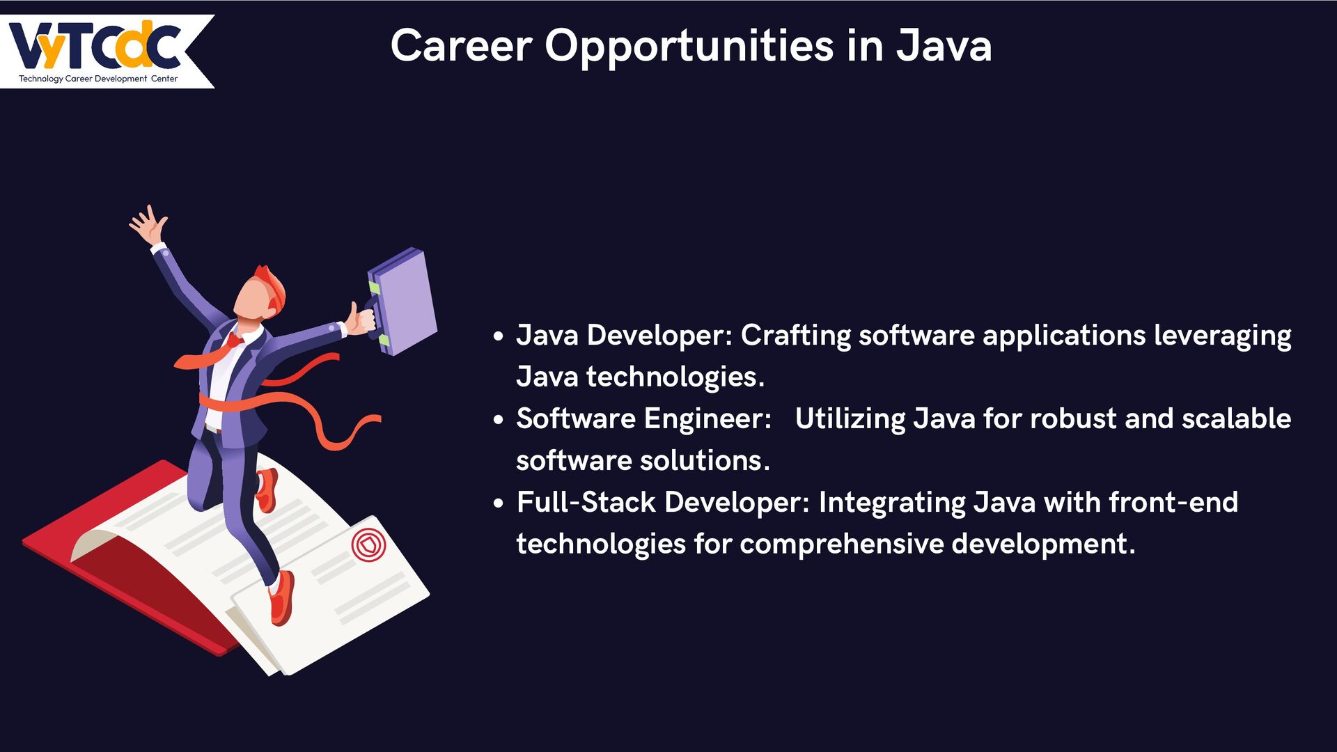 Upon completing our training, you'll be well-prepared for roles such as Java Developer, Software Engineer, Full Stack Developer, and Application Developer. As a Java developer, you'll be responsible for designing, implementing, and maintaining Java-based applications. Software engineers focus on developing software solutions and optimizing system performance. Full-stack developers work on both the front-end and back-end of applications, while application developers specialize in creating customized software solutions for specific purposes.