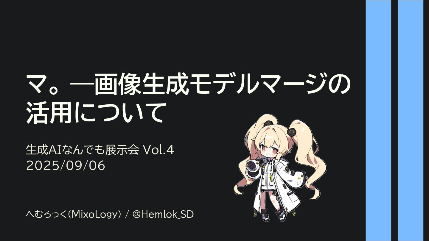 マ。 ―画像生成モデルマージの 活用について 生成AIなんでも展示会 Vol.4 2025/09/06 へむろっく(MixoLogy) / @Hemlok_SD