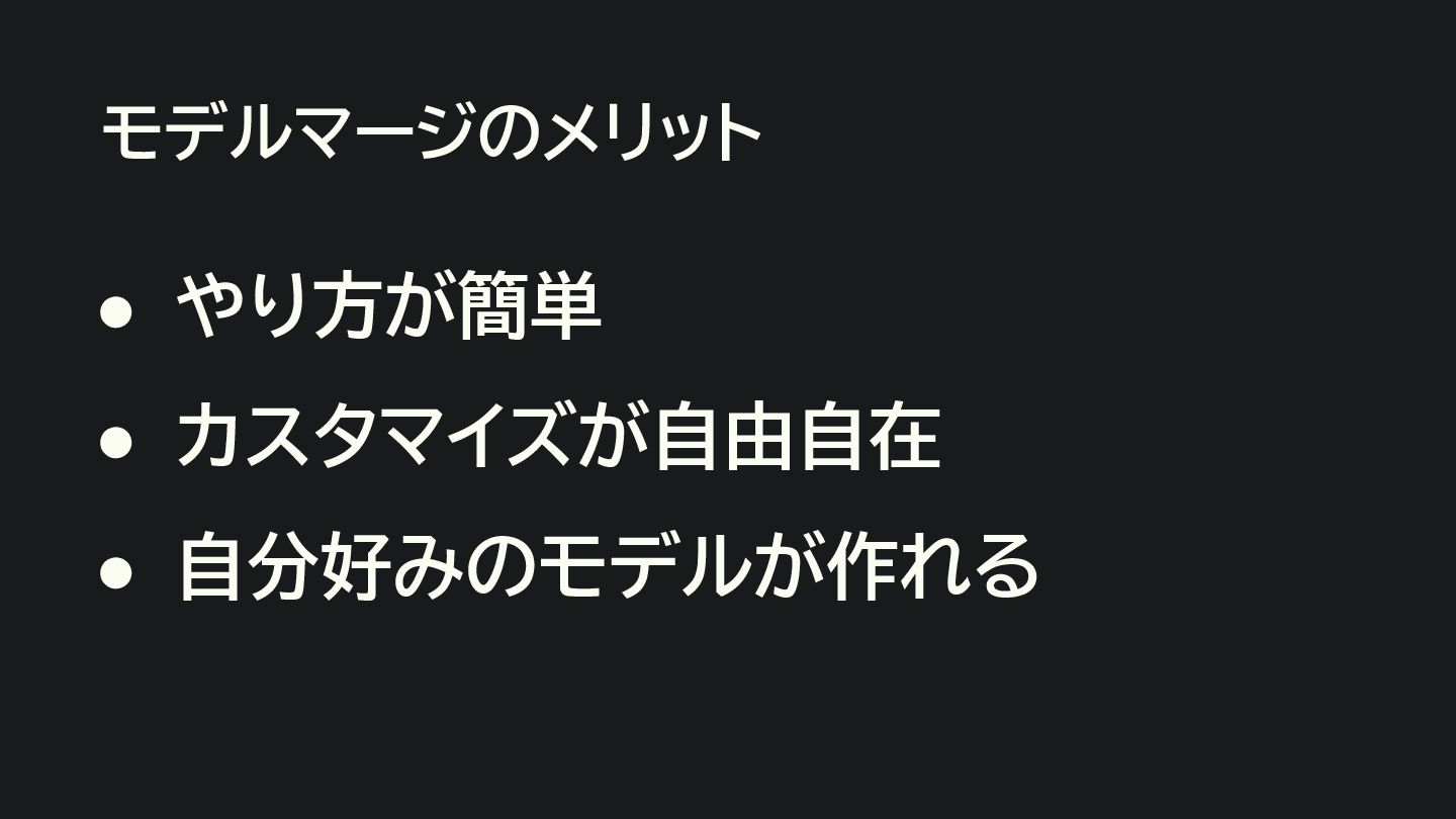 • やり方が簡単 • カスタマイズが自由自在 • 自分好みのモデルが作れる モデルマージのメリット