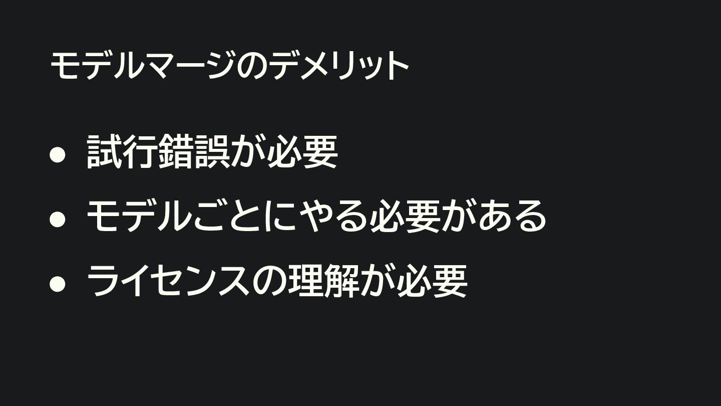 • 試行錯誤が必要 • モデルごとにやる必要がある • ライセンスの理解が必要 モデルマージのデメリット