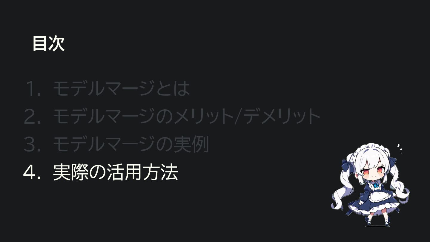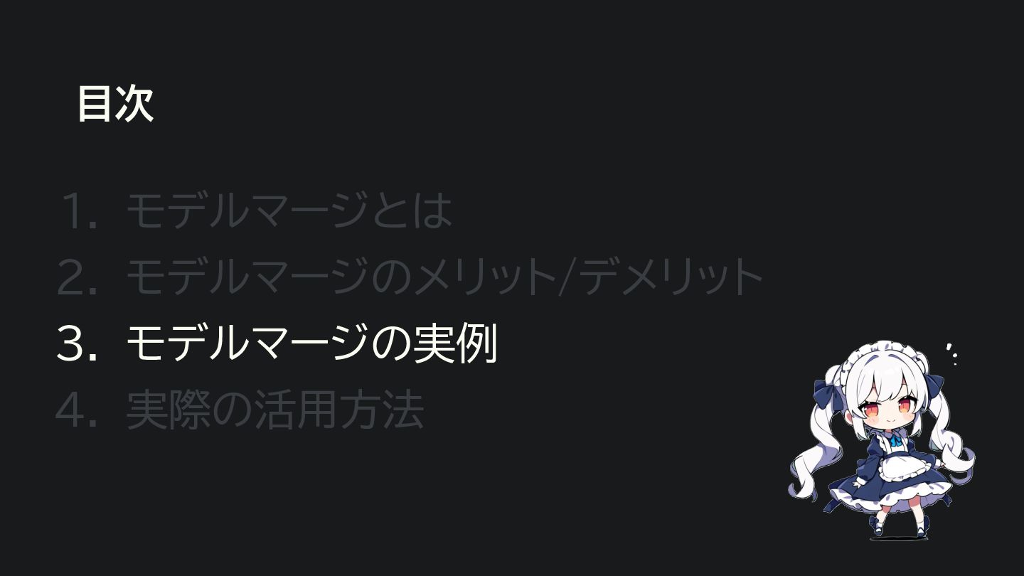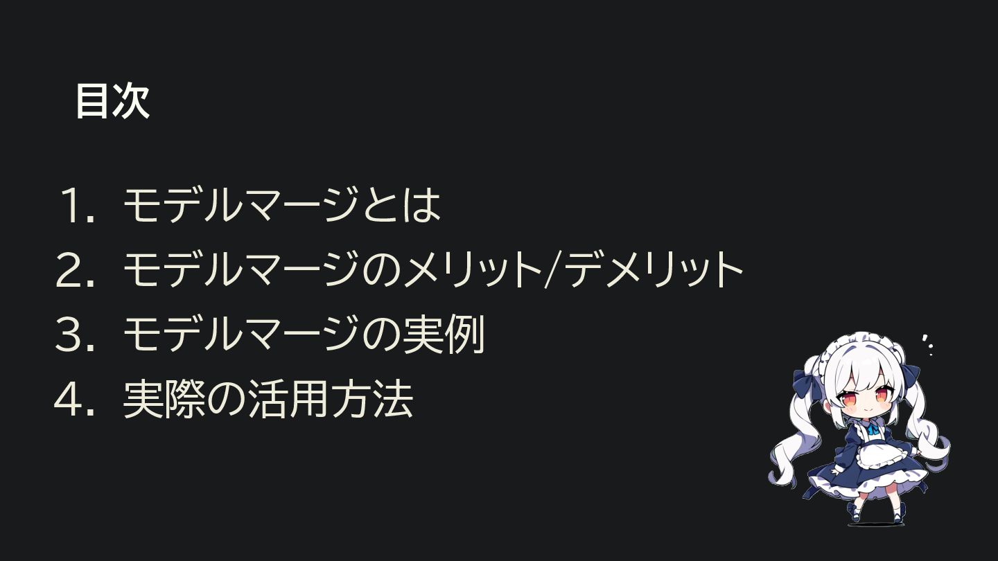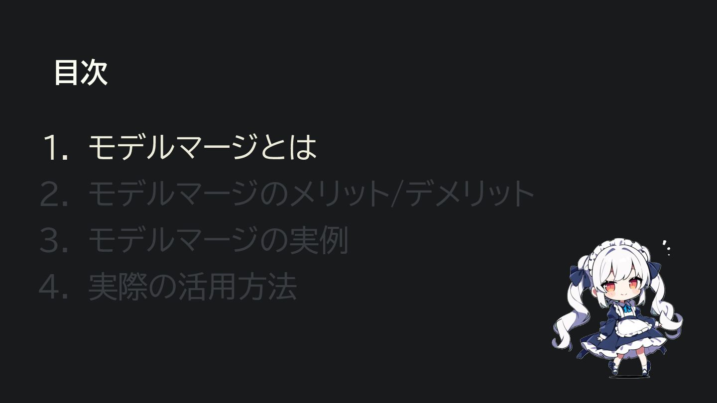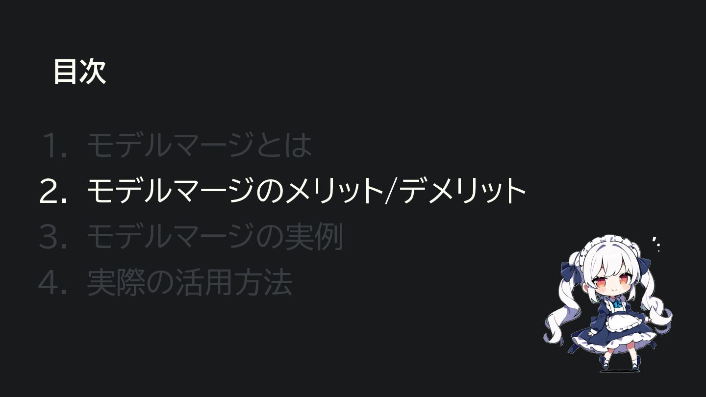 目次 1. モデルマージとは 2. モデルマージのメリット/デメリット 3. モデルマージの実例 4. 実際の活用方法