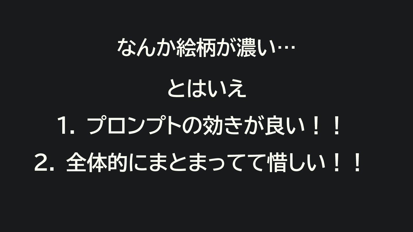 とはいえ 1. プロンプトの効きが良い!! 2. 全体的にまとまってて惜しい!! なんか絵柄が濃い…