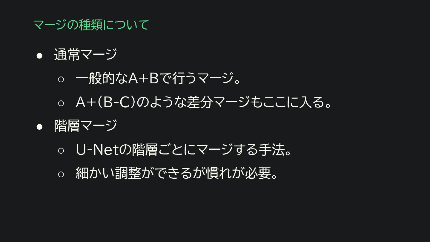• 通常マージ ◦ 一般的なA+Bで行うマージ。 ◦ A+(B-C)のような差分マージもここに入る。 • 階層マージ ◦ U-Netの階層ごとにマージする手法。