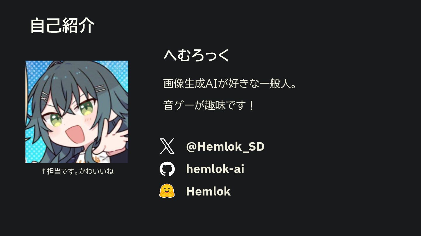自己紹介 画像生成AIが好きな一般人。 音ゲーが趣味です! へむろっく ↑担当です。かわいいね @Hemlok_SD hemlok-ai Hemlok