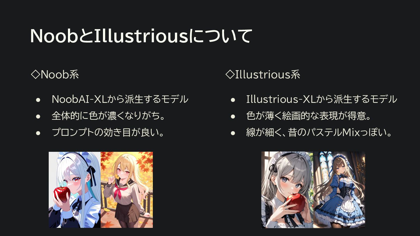 NoobとIllustriousについて ◇Noob系 • NoobAI-XLから派生するモデル • 全体的に色が濃くなりがち。 • プロンプトの効き目が良い。 ◇Illustrious系 •